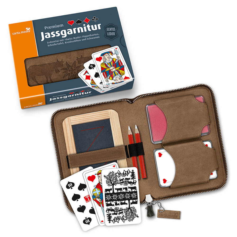 Hochwertige Qualität zum anfassen. Wunderschöne Jassgarnitur aus feinstem Rinds-Leder. Handgemacht für höchste Qualitätsansprüche mit liebvollen Details. Etui mit Kuh/Edelweissprägung und hochwertigen in der Schweiz produzierten Jasskarten mit Scherenschnittmotiv. Etui: Made in Europe, Jasskarten: Made in Switzerland.