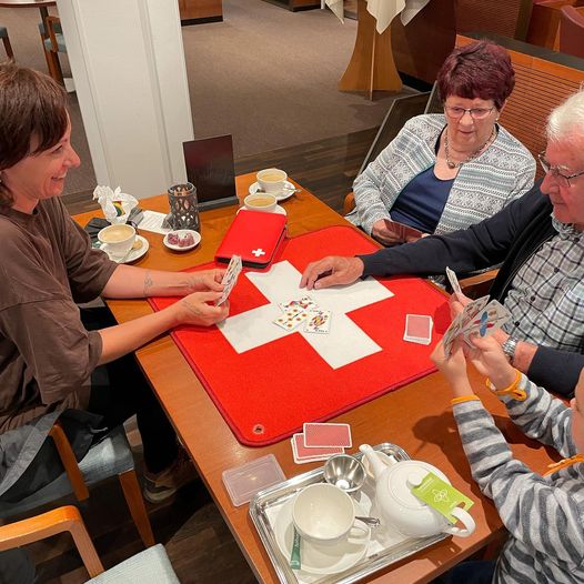 Jassteppich Rot mit weissem Kreuz.