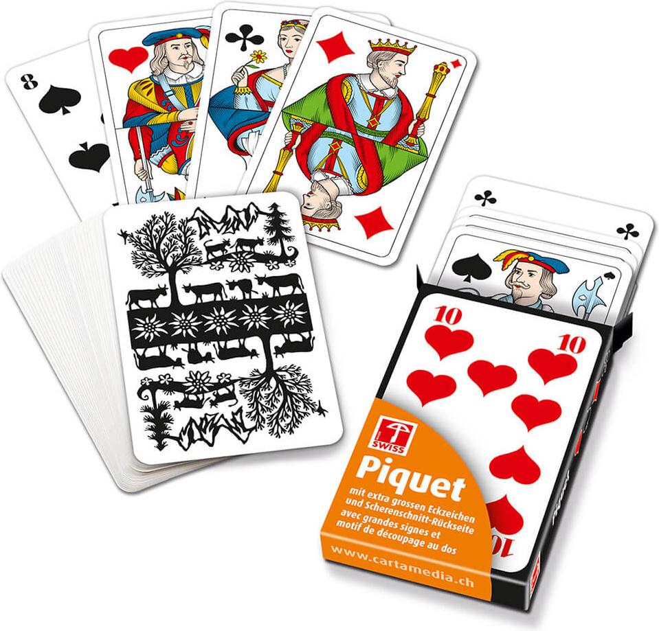 Die Piquetkarten sind in stabiler Faltschachtel verpackt und im Originalformat von 57 x 89 mm. Produziert vom Schweizer Spielkartenhersteller carta.media. Komplette Produktion in der Schweiz. Umweltfreundliche Verpackung ohne Plastik.