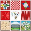 Inhalt: 8 Spielpläne, 33 Spielkarten, 60 Halmakegel, 32 Dame-Steine, 3 Augenwürfel, 1 Dopplerwürfel und 1 Spielanleitung.
