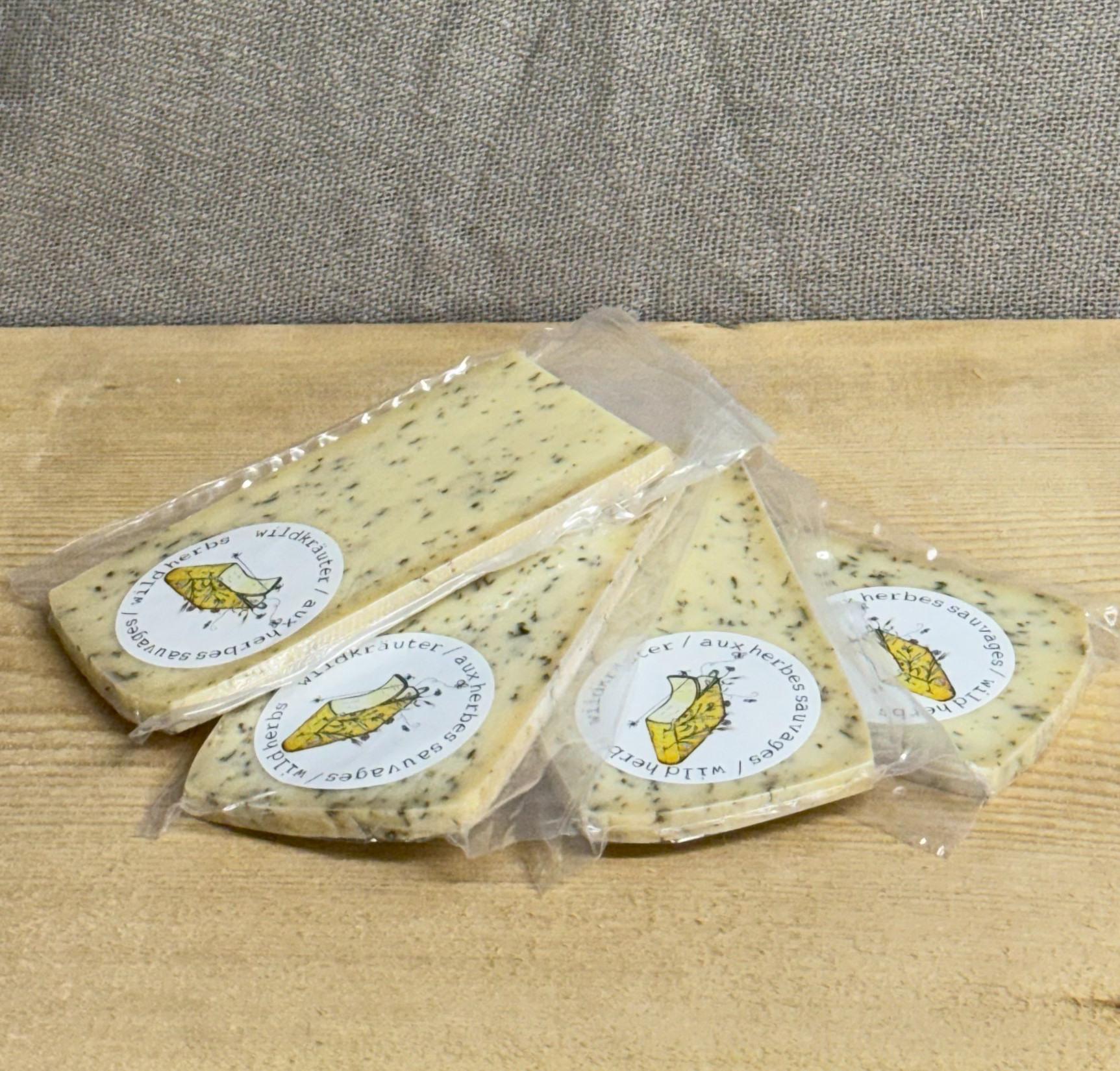 Eines Tages brachte Isa einen duftenden Strauß Rosmarin mit. Käthi brachte am nächsten Tag einen stolzes Büschel Thymian und Salbei. Finä hat zwar keinen Garten, sammelte jedoch im Wald einen Korb voller Bärlauch. Mit Chrigu’s superscharfem Messer hat Jumi aus all den frischen Wildkräutern eine grüne, würzige Mischung gemacht und unter den Käsebruch gemischt. So kann man auch an den verschneiten Tagen einen Spaziergang durch die Wiesen und Wälder machen.
