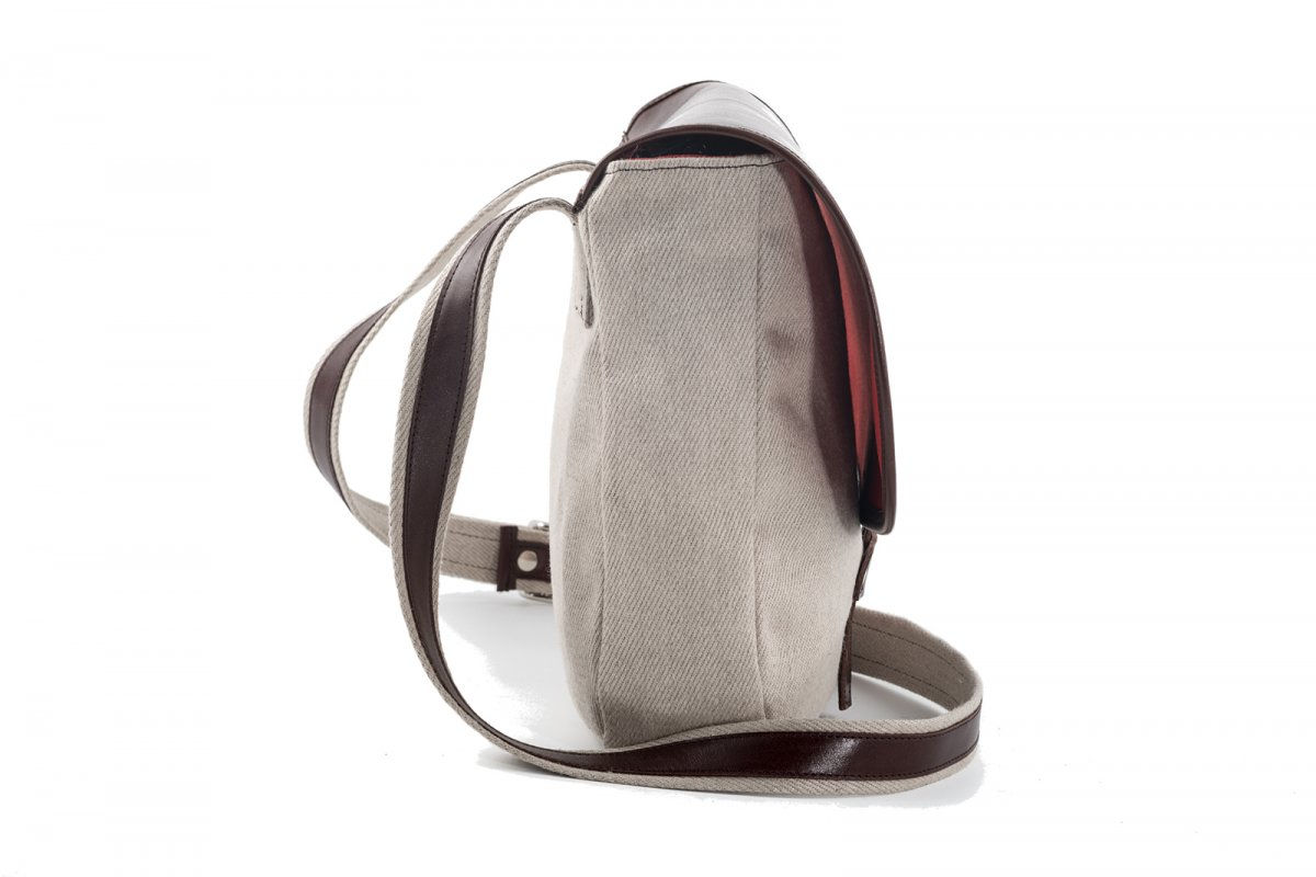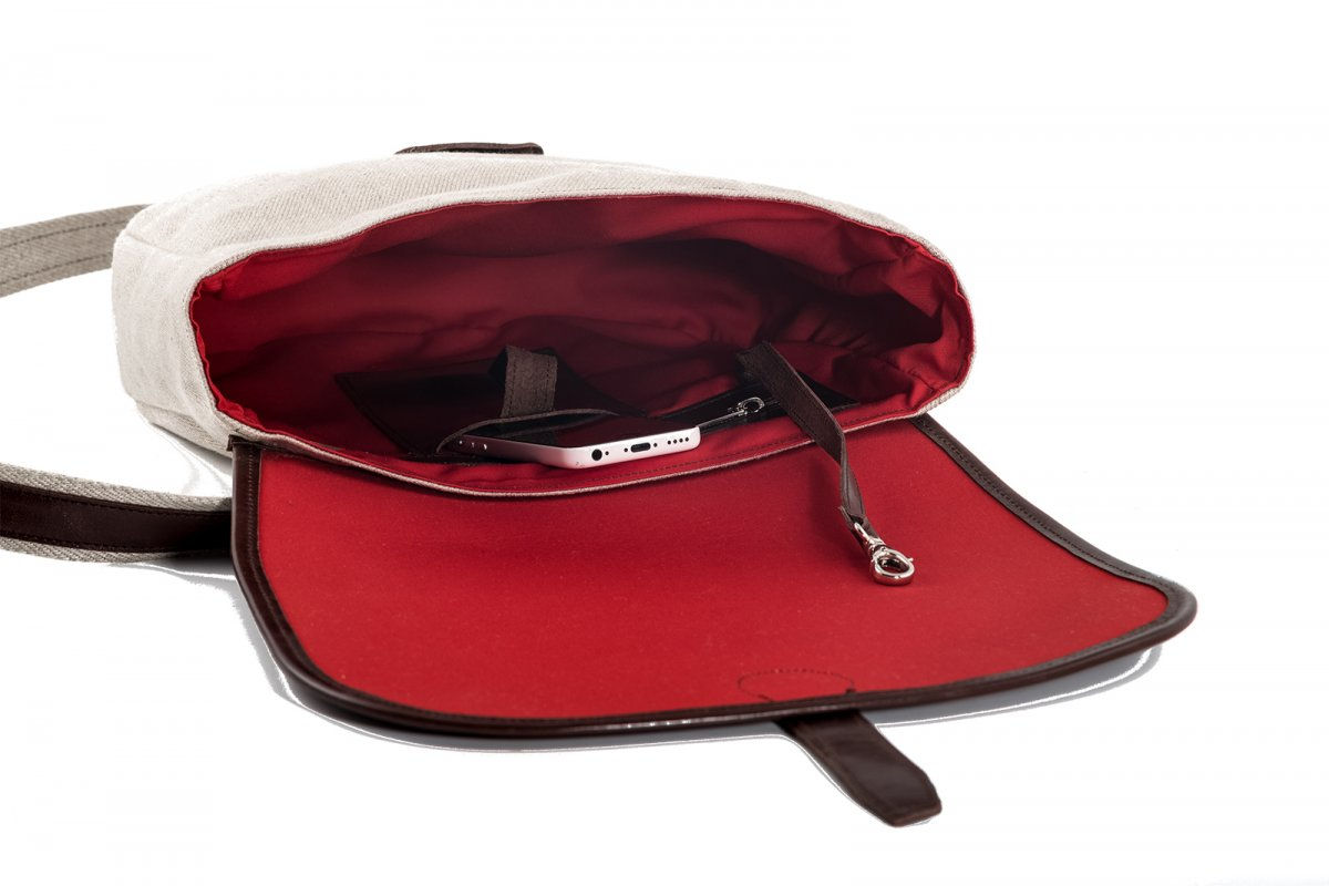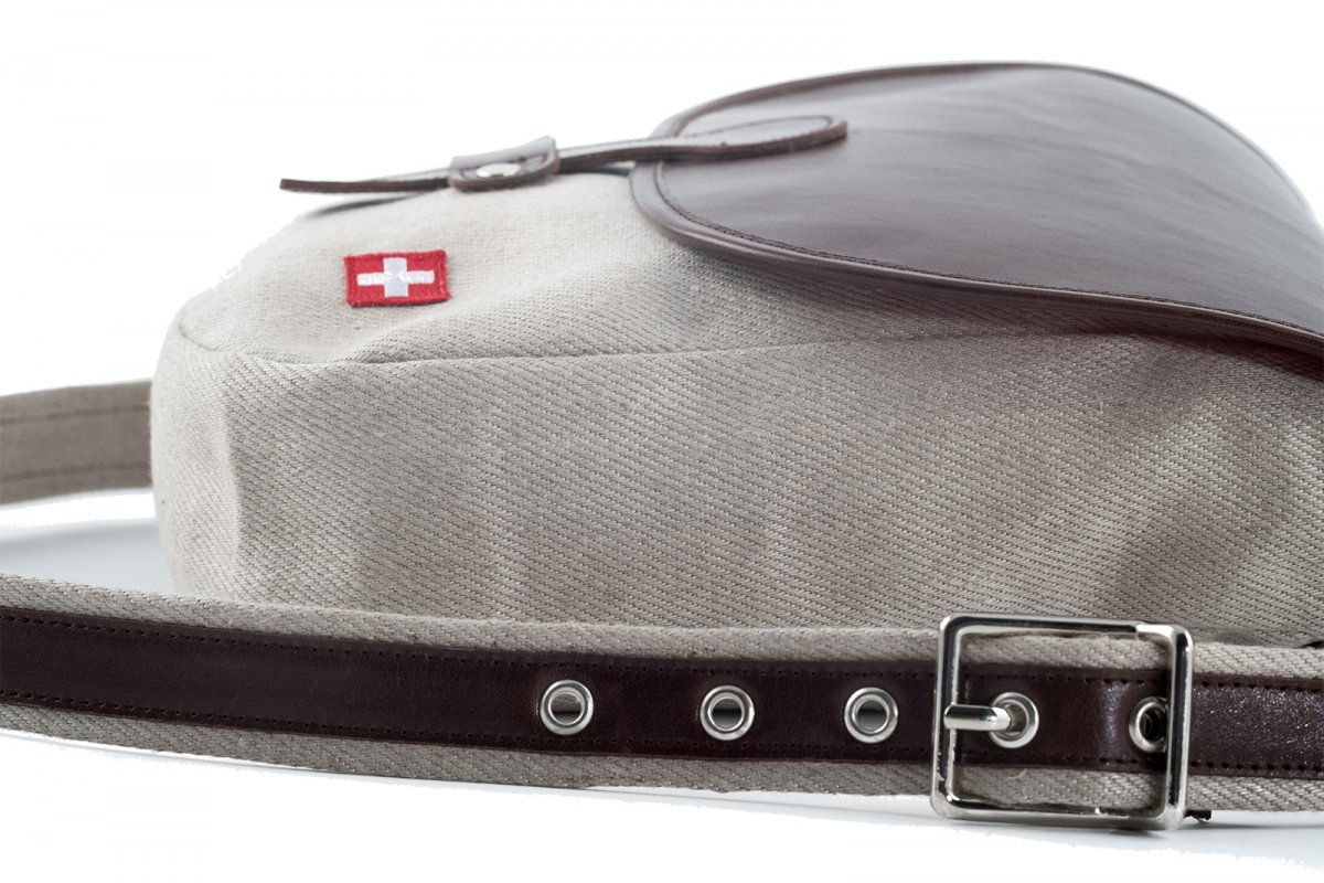 Eine Damen Handtasche mit gleich mehreren Hinguckern. Ein aufwendig verarbeitet Leder-Trägerriemen, der Laschenverschluß und last but not least, das Material. Feinstes Leder mit Zwilch Stoff. Der ist äußerst robust. Deshalb wird er auch für die Schwingerhosen verarbeitet.