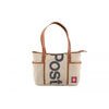 Zum Material passend ziert ein Patch in Form einer Briefmarke eine Ecke der Tasche.