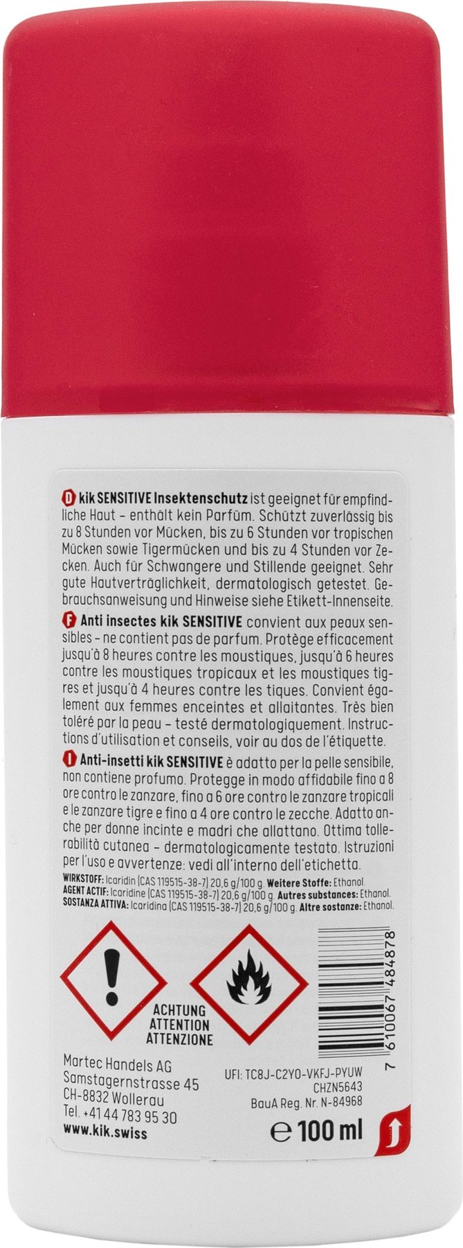 Wird Sonnencrème verwendet, diese zuerst auftragen, 20 Minuten warten und danach kik SENSITIVE Insektenschutz auftragen.