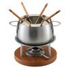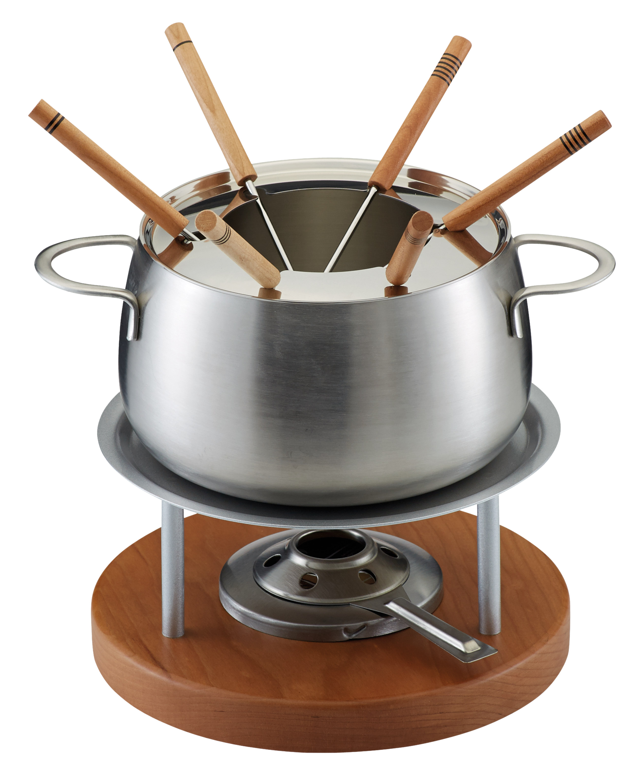 Das Fondueset überzeugt nicht nur mit seinem modernen Design, sondern auch mit seiner Ausstattung. Neben dem Edelstahltopf, der einen Durchmesser von 15cm hat und zwei Liter fasst, sind ein Spritzschutz aus Edelstahl, ein hochwertiger Rechaud mit Kirschholzboden und Pastenbrenner sowie sechs Kirschholzgabeln mit Kreismarkierungen im Lieferumfang enthalten. Übrigens eignet sich der Feuertopf für alle Herdarten auch Induktion.