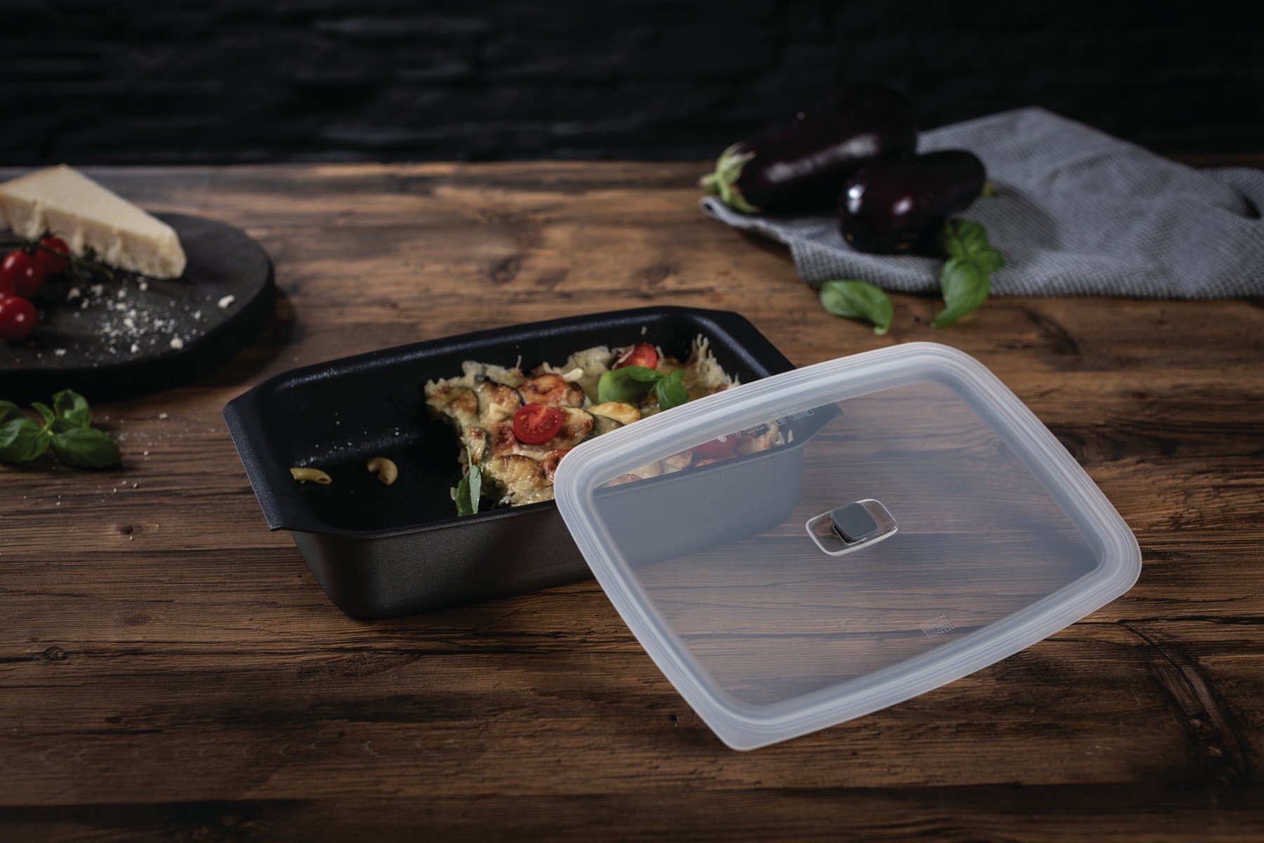 Die NEW LIFE® PRO Ofenform besteht aus hochwertigem, zu 100 % recyceltem Aluminium aus Europa und setzt neue Maßstäbe in Sachen Nachhaltigkeit. Bis zu 95 % weniger Energie und CO2 werden im Vergleich zu herkömmlichen Ofenformen eingespart. Die verstärkte, 3-lagige Antihaftbeschichtung sorgt für gleichmäßige Wärmeverteilung und optimale Wärmespeicherung. Der Kunststoffdeckel ermöglicht einfaches Aufbewahren oder Mitnehmen von Speisen und reduziert den Bedarf an Frischhaltefolie. Das Ventil im Deckel lässt Restwärme entweichen und sorgt durch Runterdrücken für ein leichtes Vakuum und luftdichtes Verschliessen. Die Ofenform wird in der Schweiz hergestellt, der Deckel in China produziert und in der Schweiz geprüft und montiert. Nachhaltigkeit und Innovation für perfekte Zubereitung!