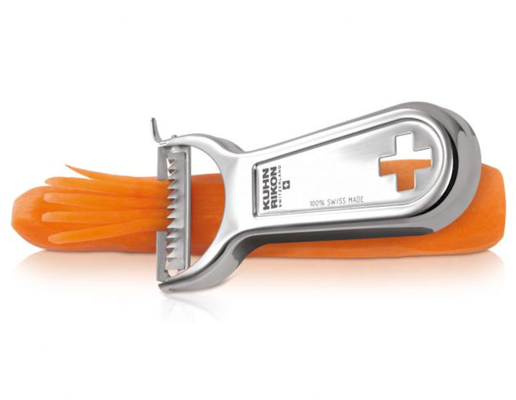 Der Swiss Metallic Peeler ist der schärfste Sparschäler von Kuhn Rikon, und das nicht nur im Design. Die Superscharfe Edelstahlklinge schneidet Gemüsestreifen, Früchteschalen und sogar Schokolade.- Swiss Made - Zu 100 % in der Schweiz hergestellt