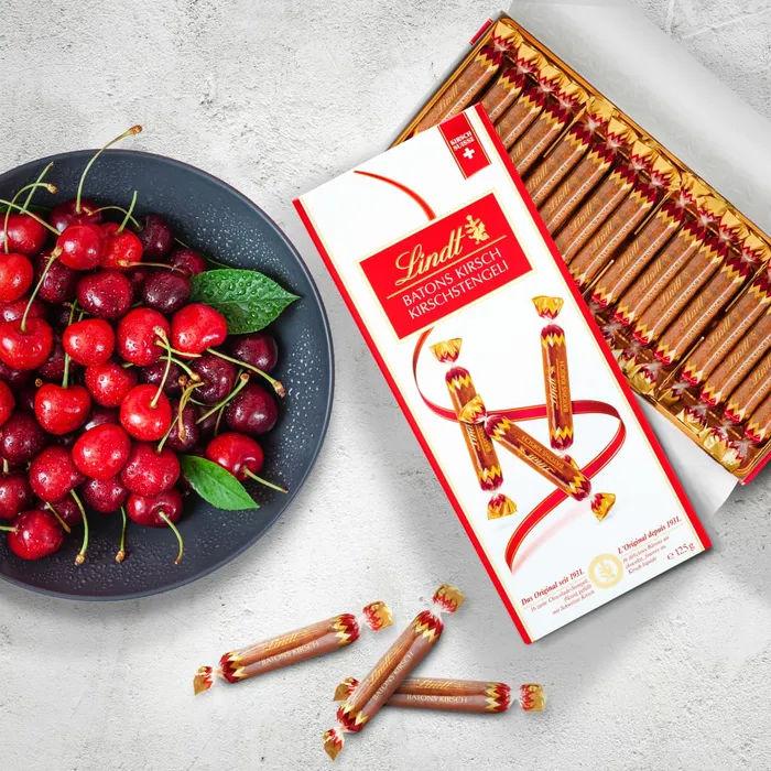 Zarte Schokoladen-Stengeli, gefüllt mit flüssigem Schweizer Kirsch. Genießen Sie ein außergewöhnliches Geschmackserlebnis der ganz besonderen Art.