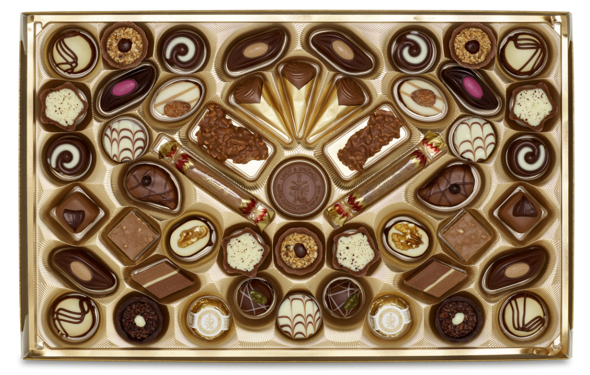 Zutaten: Zucker, Kakaomasse, Kakaobutter, Vollmilchpulver, Haselnüsse, Mandeln, Butterreinfett, MagerMILCHpulver, Glukosesirup, Traubenzucker, Milchzucker, Invertzuckersirup, pflanzliches Fett (Palm, Kokosnuss), Walnüsse, Kirschwasser, Vollmilch, Sahnepulver, Glukose-Fruktose-Sirup, Emulgator (Soja- und Sonnenblumenlecithin), Marc de Champagne, Zitronenschalen, Orangenschalen, Alkohol, Kakaokerne, Pistazien, Kaffee, fettarmes Kakaopulver, natürliche Aromen, Zitronensaftkonzentrat, Weizenmehl, Himbeerpüree, Feuchthaltemittel (Invertase, Sorbit), EIklar, Gerstenmalzextrakt, Überzugsmittel (Gummi arabicum), Aromen, Kirschsaft aus Konzentrat, Sahne, Aprikosenkerne, Säuerungsmittel (Citronensäure), Salz, natürliches Orangenaroma, Milcheiweiß, Weizenmalz, Frucht- und Pflanzenkonzentrate (Rettich, Apfel, schwarze Johannisbeere, Spirulina), natürliches Vanillearoma, Backtriebmittel (Natriumbi- und Ammoniumhydrogencarbonat), Weizenstärke, modifizierte Stärke. Kann Haselnüsse, Mandeln und andere Schalenfrüchte enthalten.