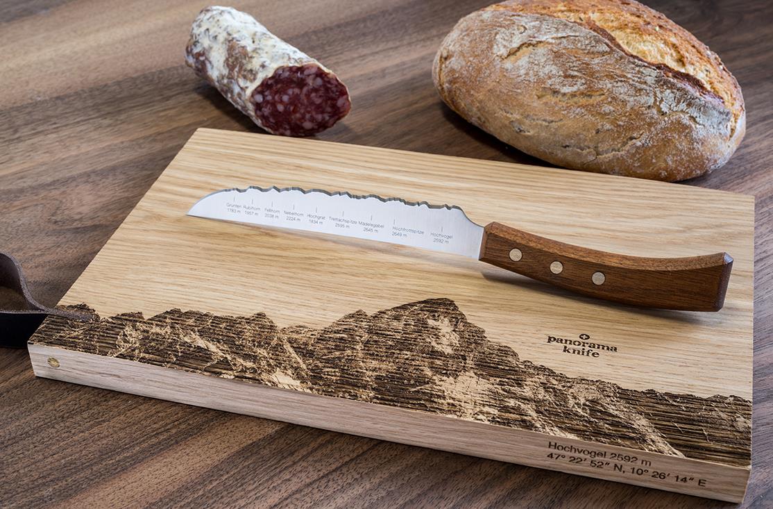 Genießen Sie beim Schneiden, Hacken oder Anrichten eine wunderschöne Bergtour vom Giebelhaus im Ostachtal zum Felsgipfel des Hochvogels. Holen Sie sich mit diesem einzigartigen Ausblick, aus Handarbeit gefertigt, ein Stück des Hochvogels zu sich nach Hause.