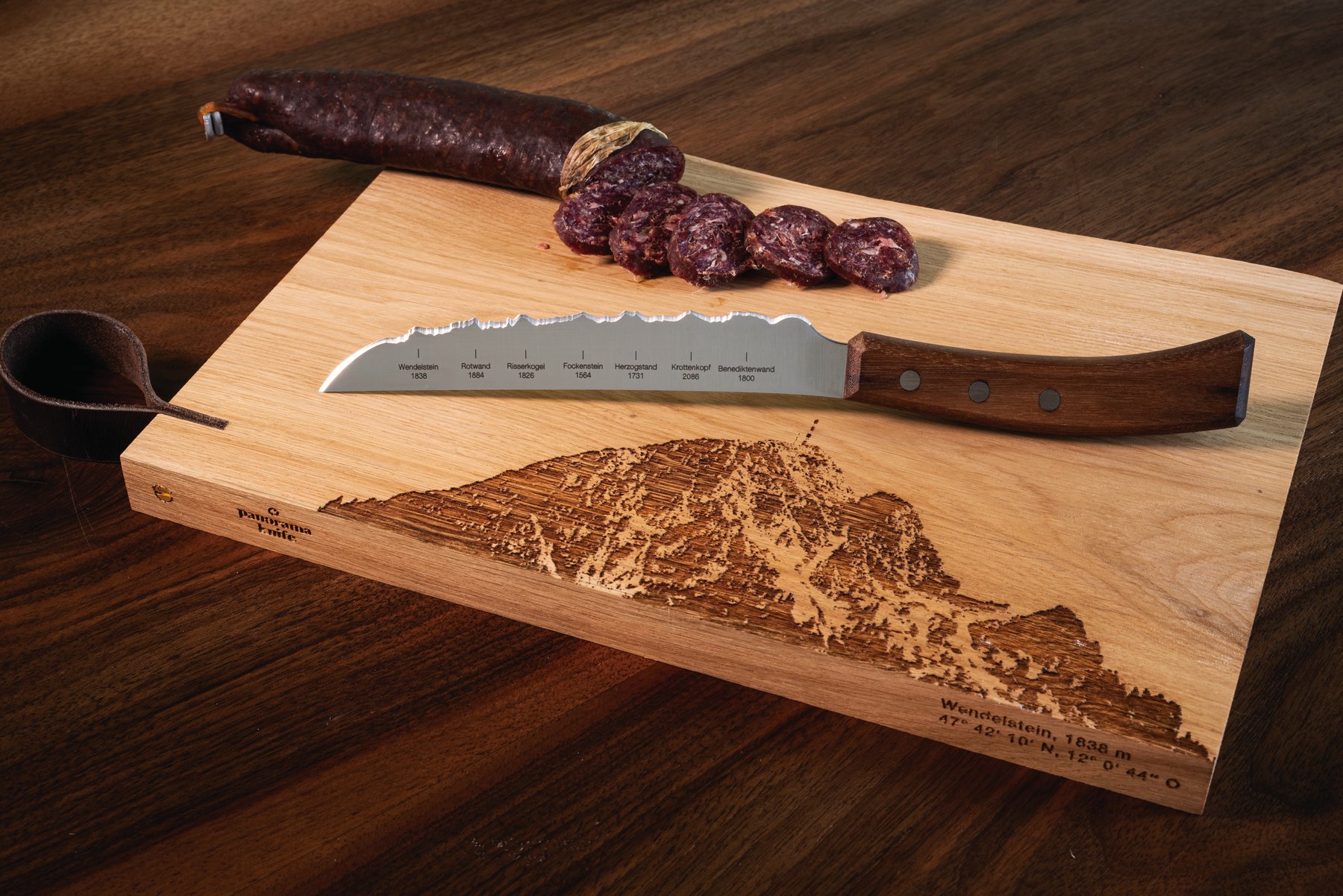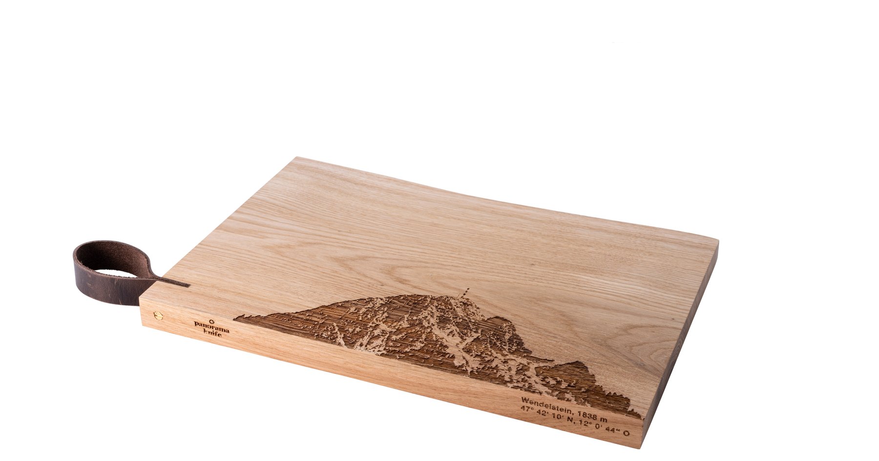 Genießen Sie beim Schneiden, Hacken oder Anrichten eine wunderschöne Bergtour vom Giebelhaus im Ostachtal zum Felsgipfel des Hochvogels. Holen Sie sich mit diesem einzigartigen Ausblick aus Handarbeit gefertigt, ein Stück des Hochvogels zu sich nach Hause.