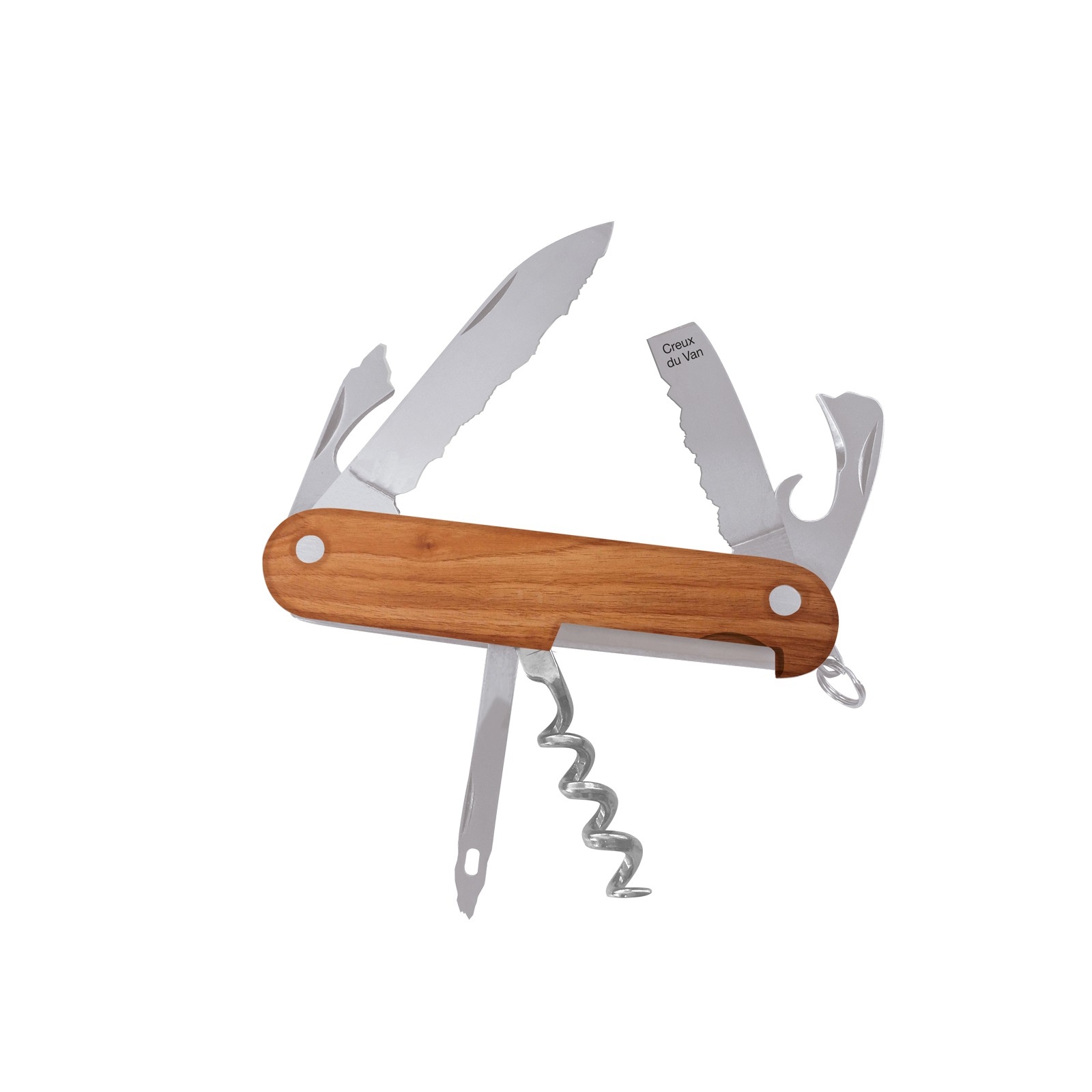 Dieses Taschenmesser ist aus wunderschönem Apfelbaumholz aus Thurgau gefertigt. Es verfügt über 9 praktische Funktionen. Die 6 Klingen des Messers werden aus Chirurgenstahl Werkstoffnummer 1.4116, Werkstoffbezeichnung AISI 440A, Rockwell Härte 54-55 HRC, gefertigt.