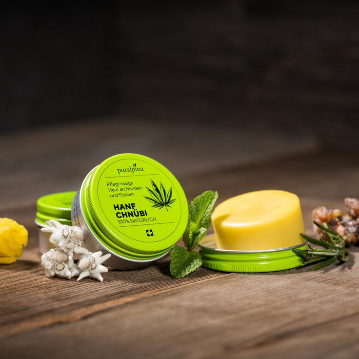 Das Hanf-Chnübi wird mit Schweizer Hanfsediment, Hanföl, Gemsfett aus der Schweizer Jagd, Berner Oberländer Bienenwachs und vielen weiteren wertvollen Zutaten hergestellt. Ausschließlich aus natürlichen Rohstoffen aus den Alpen - wo möglich aus der unmittelbaren Umgebung. Die Kräuter und Blumen pflegt Puralpina wenn möglich im Kandertal im Berner Oberland. Diese Pflanzen bieten den Wild- und Honigbienen eine wertvolle Lebensgrundlage.