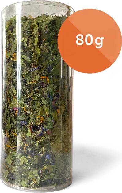 Zutaten: Zitronenmelisse, Malve, Pfefferminze, Brennnessel, Ringelblume, Kornblume rosa