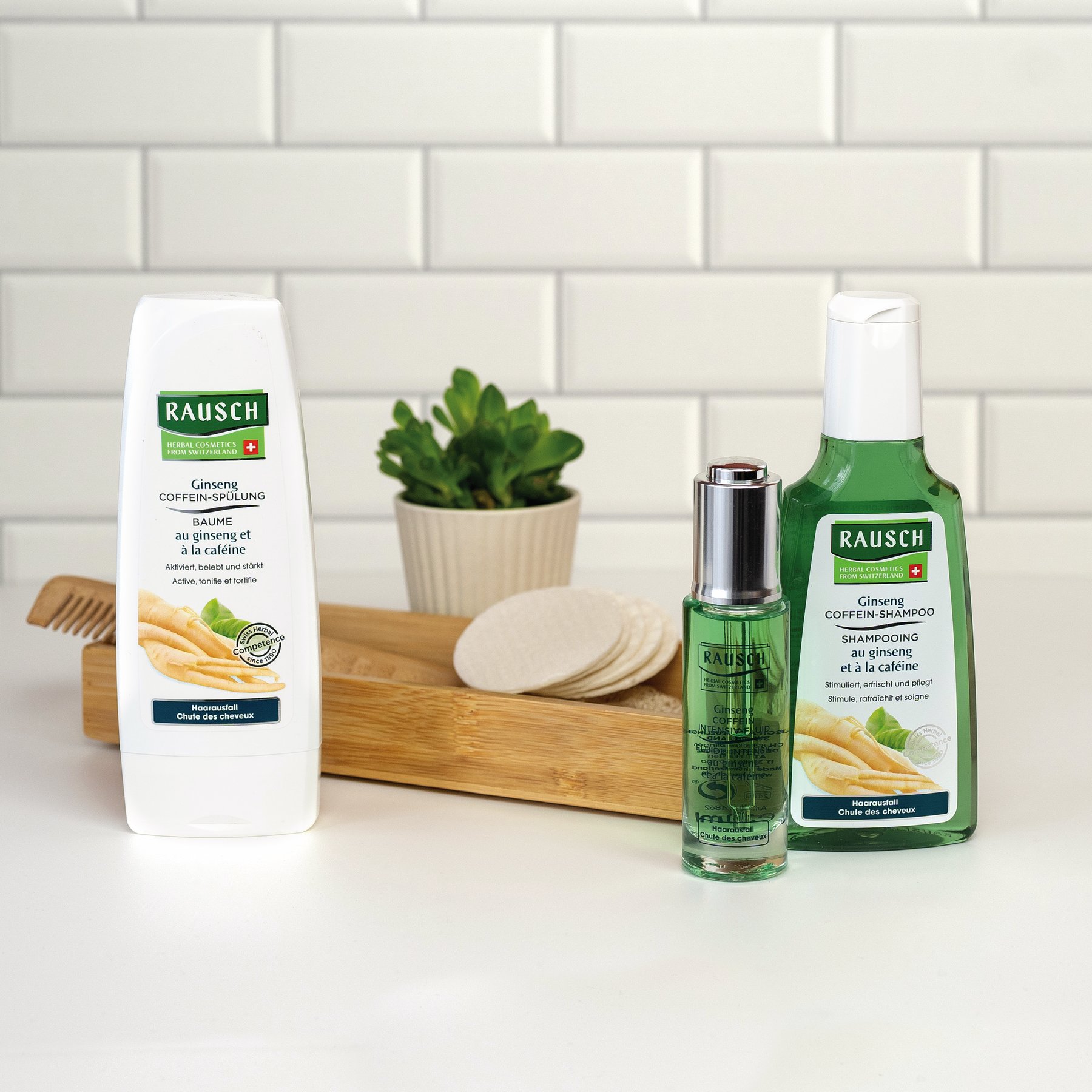 Wir besitzen durchschnittlich 100.000 Kopfhaare. Jedes davon durchläuft eine Wachstums-, eine Übergangs- und eine Ruhephase, an deren Ende es ausfällt. Die zeitliche Verschiebung dieser Haarzyklen sorgt für einen gleichbleibenden Haarbestand. Die Ginseng COFFEIN-LINIE von RAUSCH verbessert nachhaltig die Durchblutung der Kopfhaut und unterstützt den natürlichen Haarnachwuchs. Die Haarstruktur wird verbessert und das Haar griffiger und stärker.