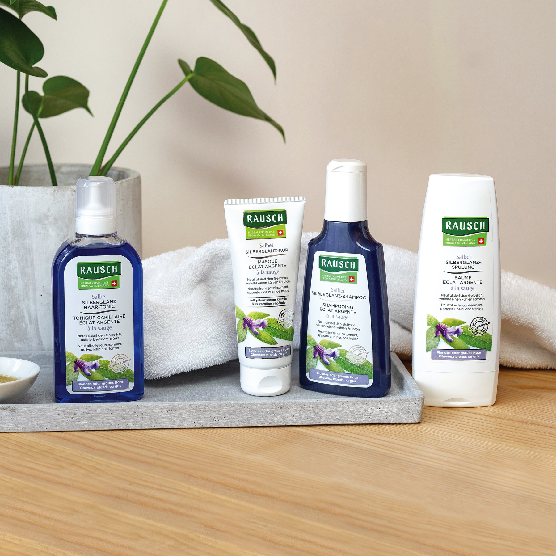 Blondiertes Haar, blonde Strähnen und graues Haar können zu einem unerwünschten Gelbstich neigen. Zudem sind sie anfälliger für äussere Einflüsse, brauchen Schutz vor Hitze und dem Austrocknen. Die Salbei SILBERGLANZ-LINIE von RAUSCH bringt kühle Nuancen zum Strahlen und verbessert die Haarstruktur. Violette Pigmente neutralisieren gelbe Verfärbungen.