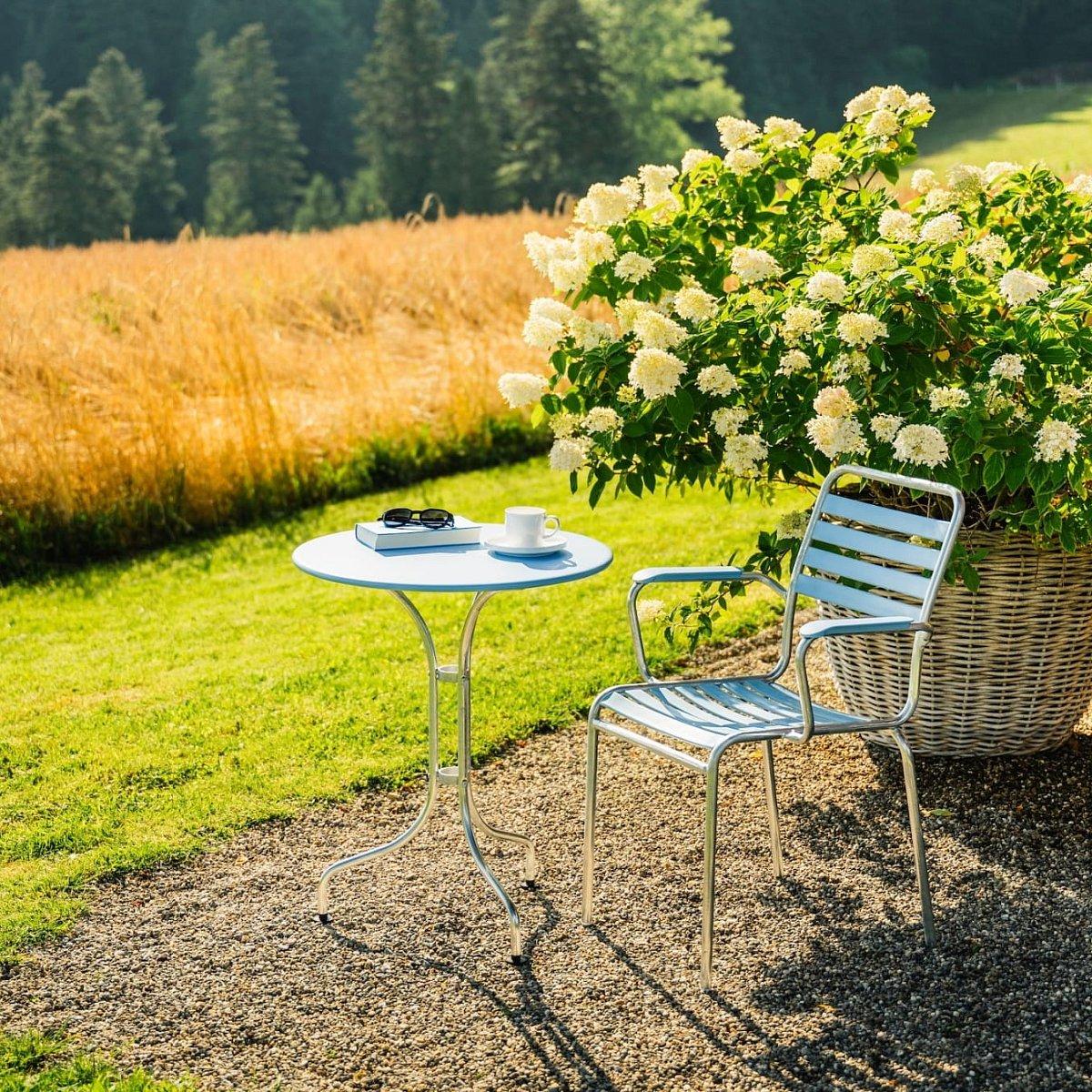 Der Schaffner Metalltisch St. Moritz mit 60 cm Durchmesser ist ein echter Klassiker unter den Gartentischen. Inspiriert vom Charme traditioneller Straßencafés verbindet er nostalgisches Design mit moderner Materialtechnologie – ideal für stilvolle Outdoor-Bereiche mit Anspruch.
