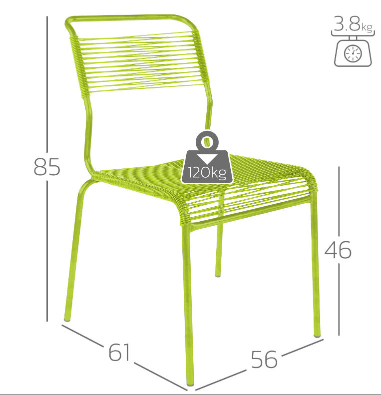 Trotz ihrer Leichtigkeit sind die filigranen Stühle sehr stabil und stapelbar. Dank Spaghetti Bespannung aus PVC-Schnur ist die Sitzfläche bzw. Rückenlehne außerordentlich komfortabel und durch ihre robuste Wetterfestigkeit auch einfach zu reinigen.