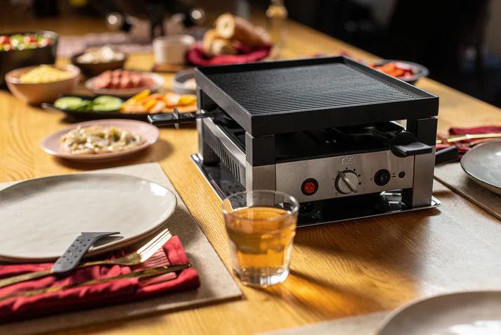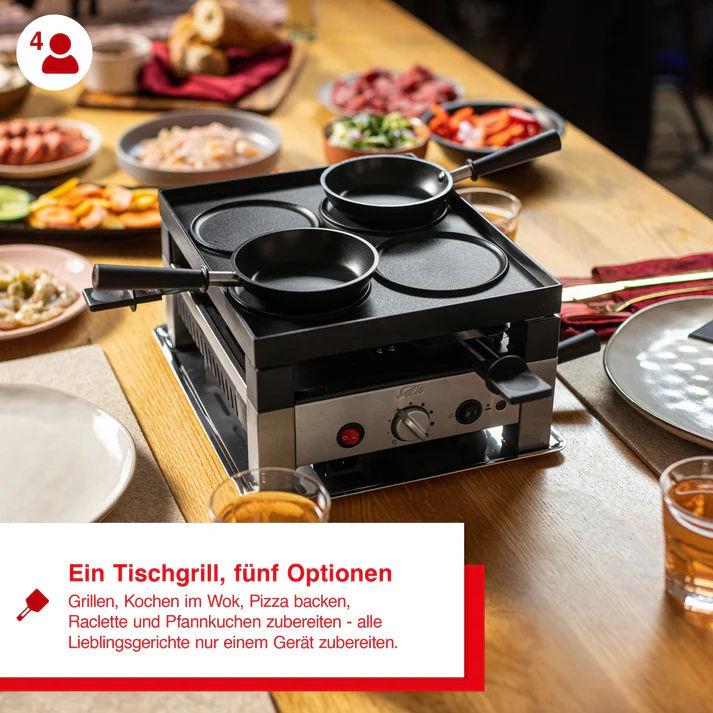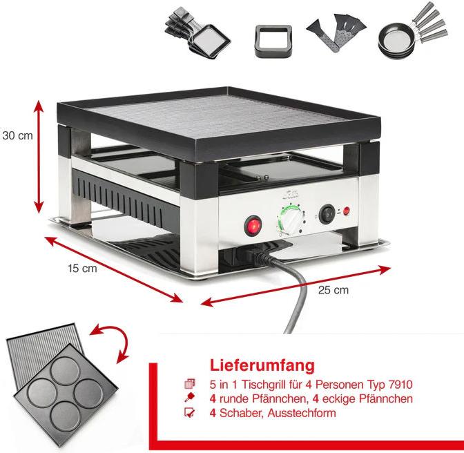- Ein Tischgrill, 5 Geräte (Grillen, Mini Pizza, Mini Wok, Crepes und Raclette)