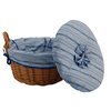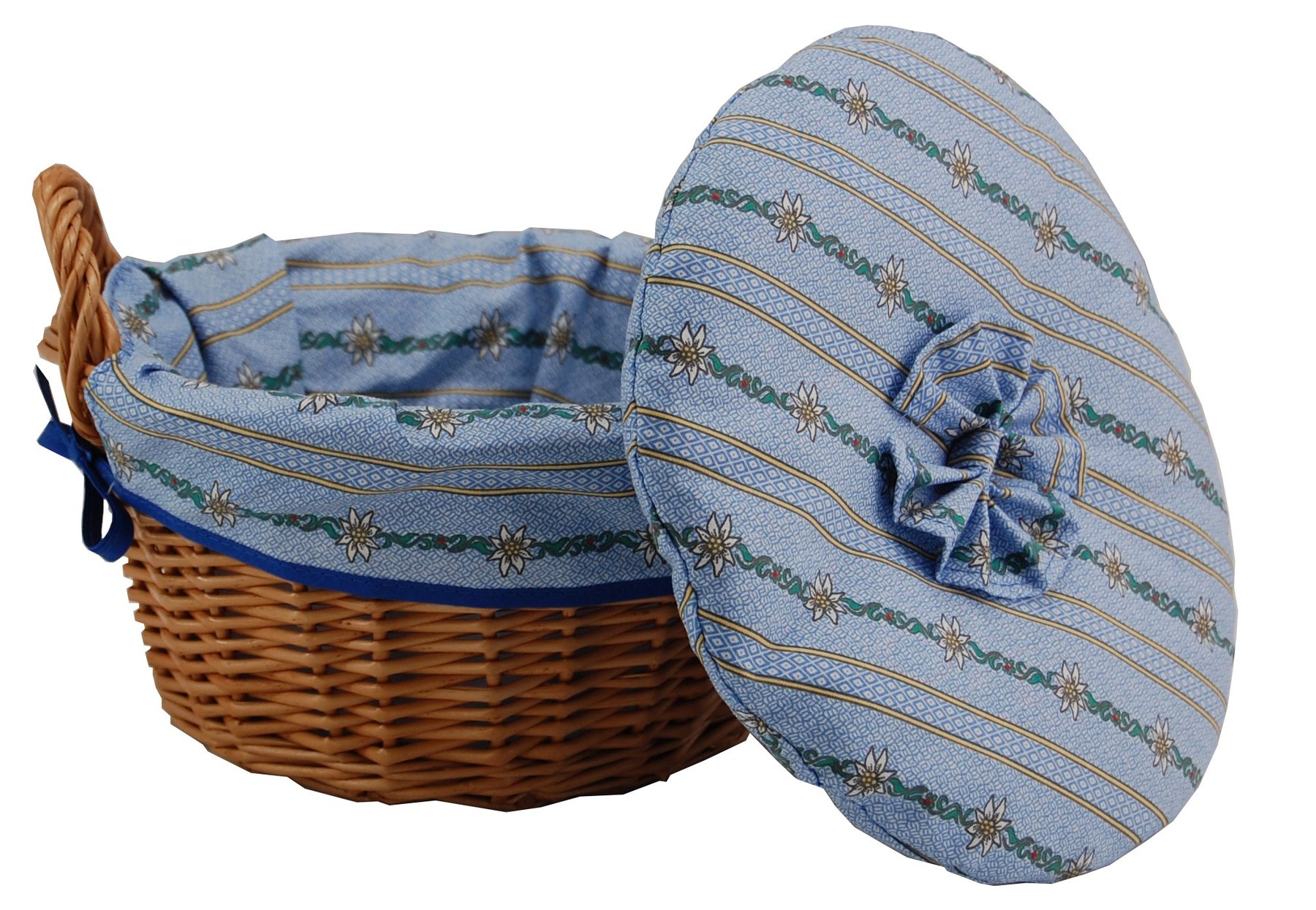 Kartoffel-Warmhaltekorb mit Stoffbezug "Edelweiß" auf hellblauem Grund. Damit die Kartoffeln nach dem Kochen noch lange heiß zum Raclette genossen werden können.