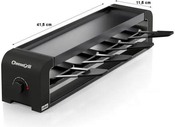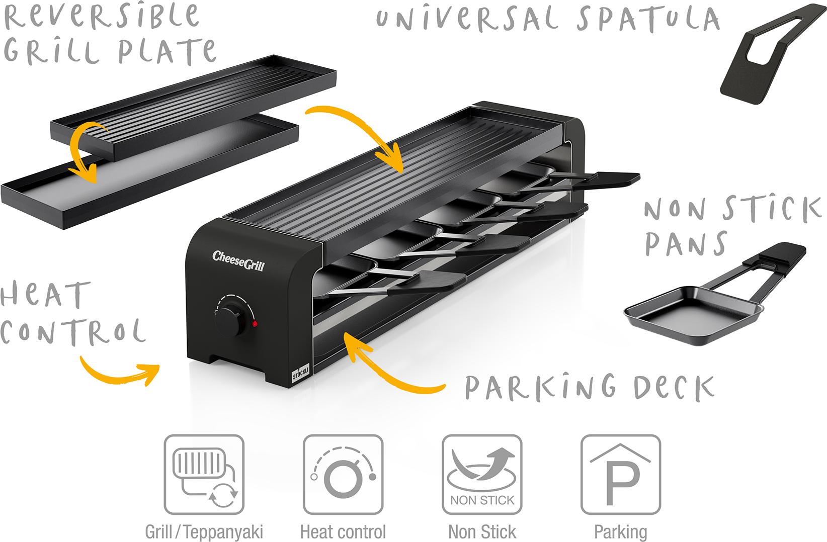 Der mit vier antihaftbeschichteten Stahlblech-Pfännchen und vier Raclettespachteln aus Kunststoff ausgestattete CheeseGrill 4 ein Muss für die Küche. Einfach aufstellen, anschalten und den geselligen Raclette- und Grillabend genießen.