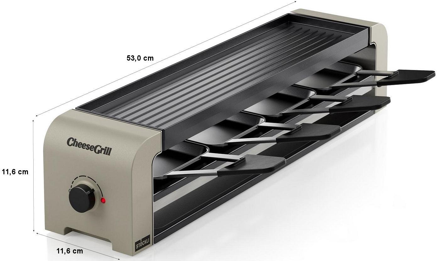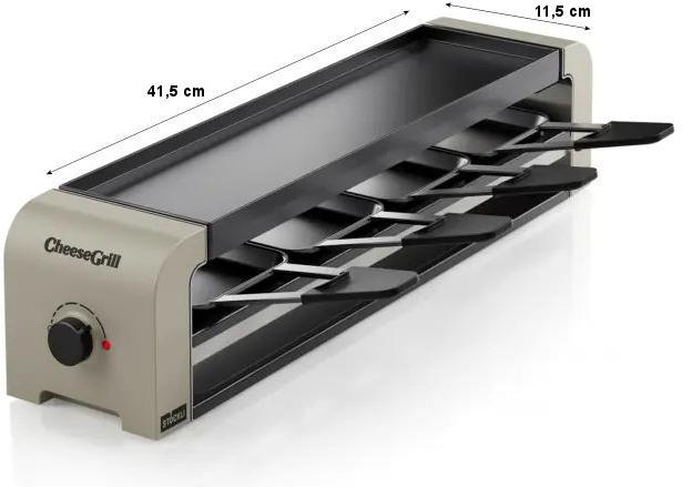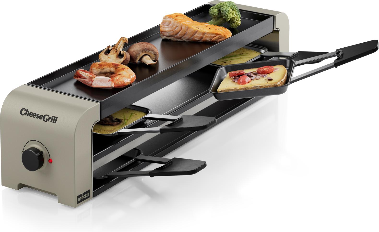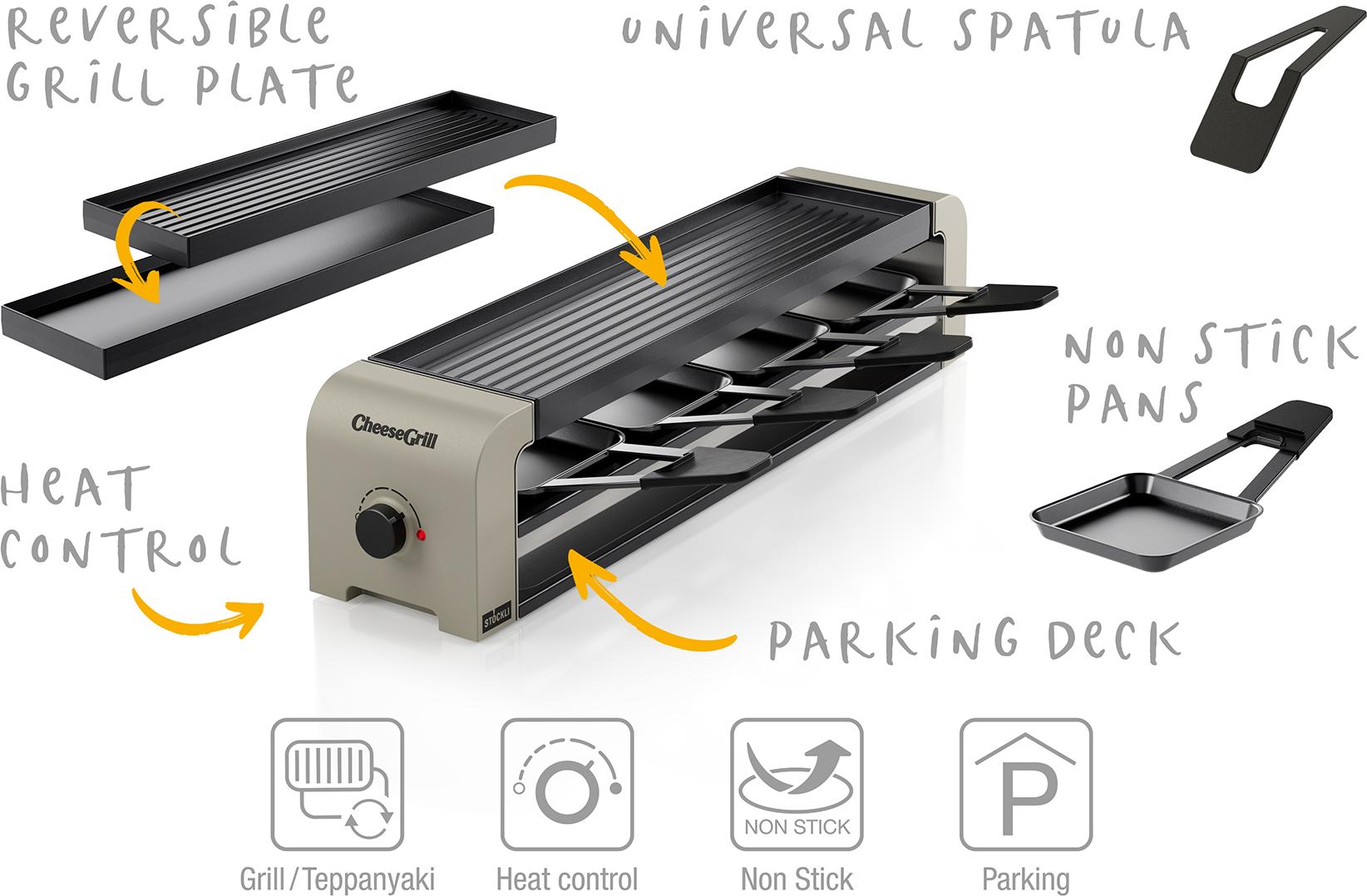 Der mit vier antihaftbeschichteten Stahlblech-Pfännchen und vier Raclettespachteln aus Kunststoff ausgestattete CheeseGrill 4 ein Muss für die Küche. Einfach aufstellen, anschalten und den geselligen Raclette- und Grillabend genießen.