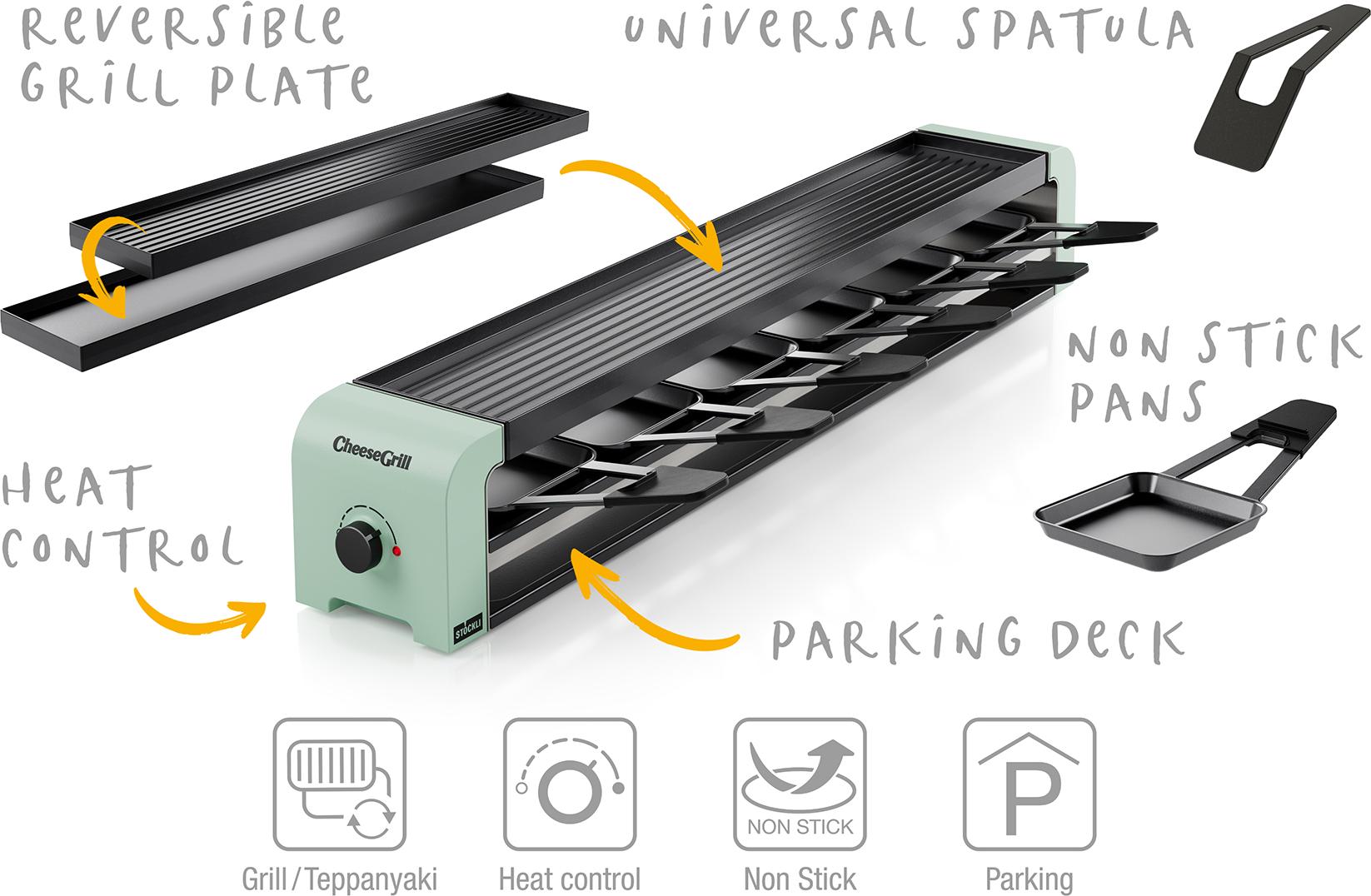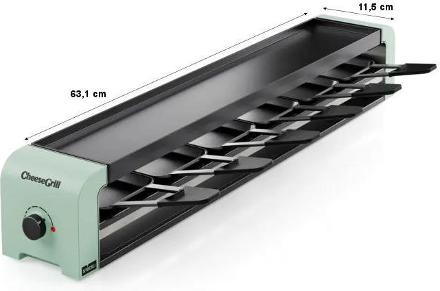 Die Antihaftversiegelung der Grillplatte erleichtert die Reinigung nach dem Gebrauch. Das für sechs Personen konzipierte Gerät ist ideal für ein geselliges Essen mit Freunden oder der Familie. Der mit sechs antihaftbeschichteten Stahlblech-Pfännchen und sechs Raclettespachteln aus Kunststoff ausgestattete CheeseGrill 6 ist ein Muss für die Küche. Einfach aufstellen, anschalten und den geselligen Raclette- und Grillabend genießen.