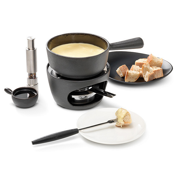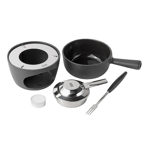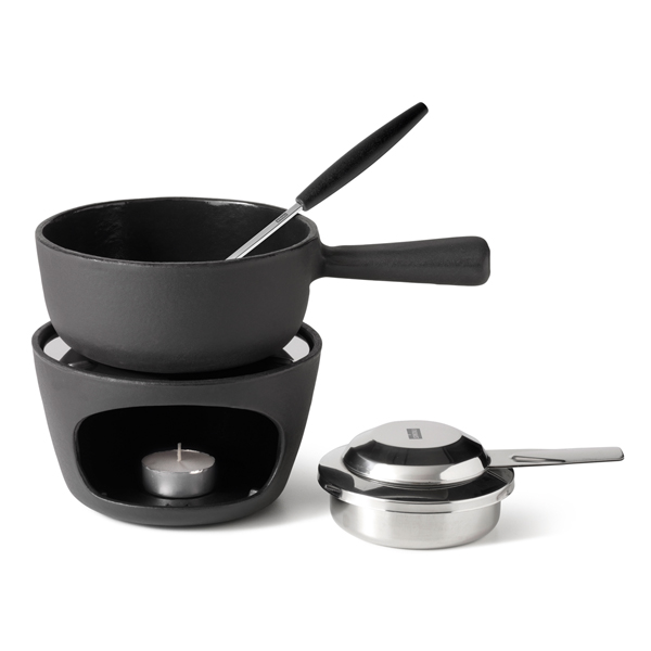 Rechaud aus Gusseisen inkl. Pasten-Sicherheitsbrenner, Rechaudkerze und einer kurzen Fonduegabel Alpine.