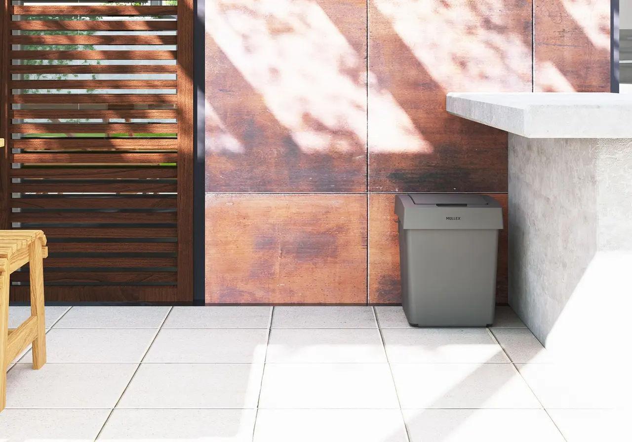 Das freistehende Abfallsystem besteht aus einem Behälter, in dem ein 35 Liter Abfallsack eingespannt werden kann. Die flexible Platzierung macht diesen praktischen Abfallsammler zu einem nützlichen Helfer in der Garage, auf der Terasse, im Büro oder Haus. Kleinere Abfälle können schnell mittels Push-Funktion des Deckels reingeworfen werden. Dank einer integrierten Metallstange schwenkt der Deckel nach dem Einwerfen automatisch zurück. Für grössere Abfälle oder bei einem volleren Müllsack kann die Pull-Funktion verwendet werden. Am kleinen Haken an der Seitenwand kann eine Kehrgarnitur befestigt werden.