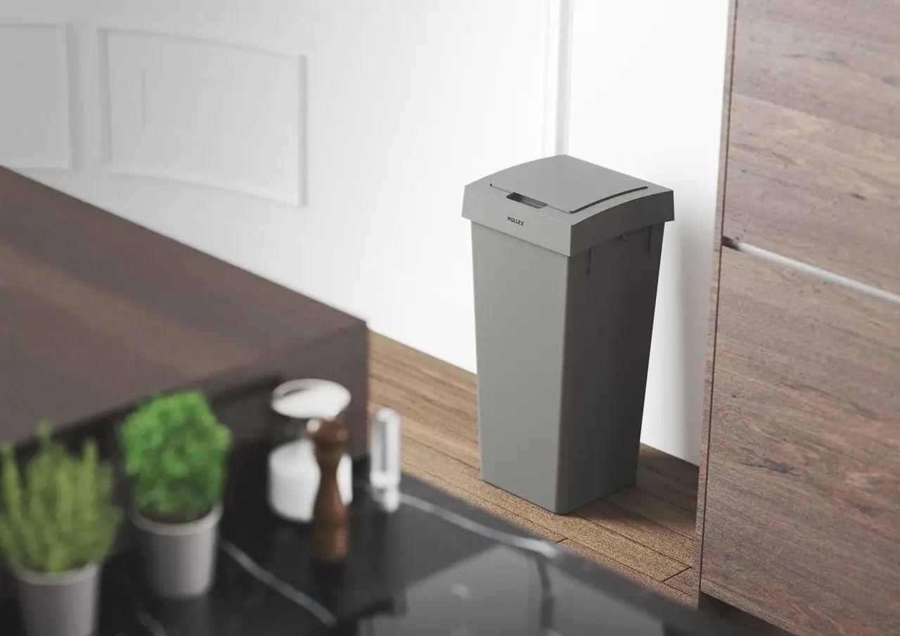 Dieser Abfalleimer kann überall dort platziert werden, wo man sie gerade braucht. Im freistehenden Abfallsystem findet ein 60 Liter Müllsack Platz. Die Handhabung ist dank ausgeklügelter Technologie unvergleichbar praktisch. Der schwenkbare Deckel mit Gegengewicht schliesst sich automatisch, wenn kleinere Abfallgüter mit der Push-Funktion entsorgt werden. Für grössere Abfallgüter oder bei einem bereits volleren Müllsack kann der Deckel mit der Pull-Funktion angehoben werden. An der Aussenseite des Behälters befindet sich zudem ein kleiner Haken, an dem eine Kehrgarnitur angebracht werden kann.