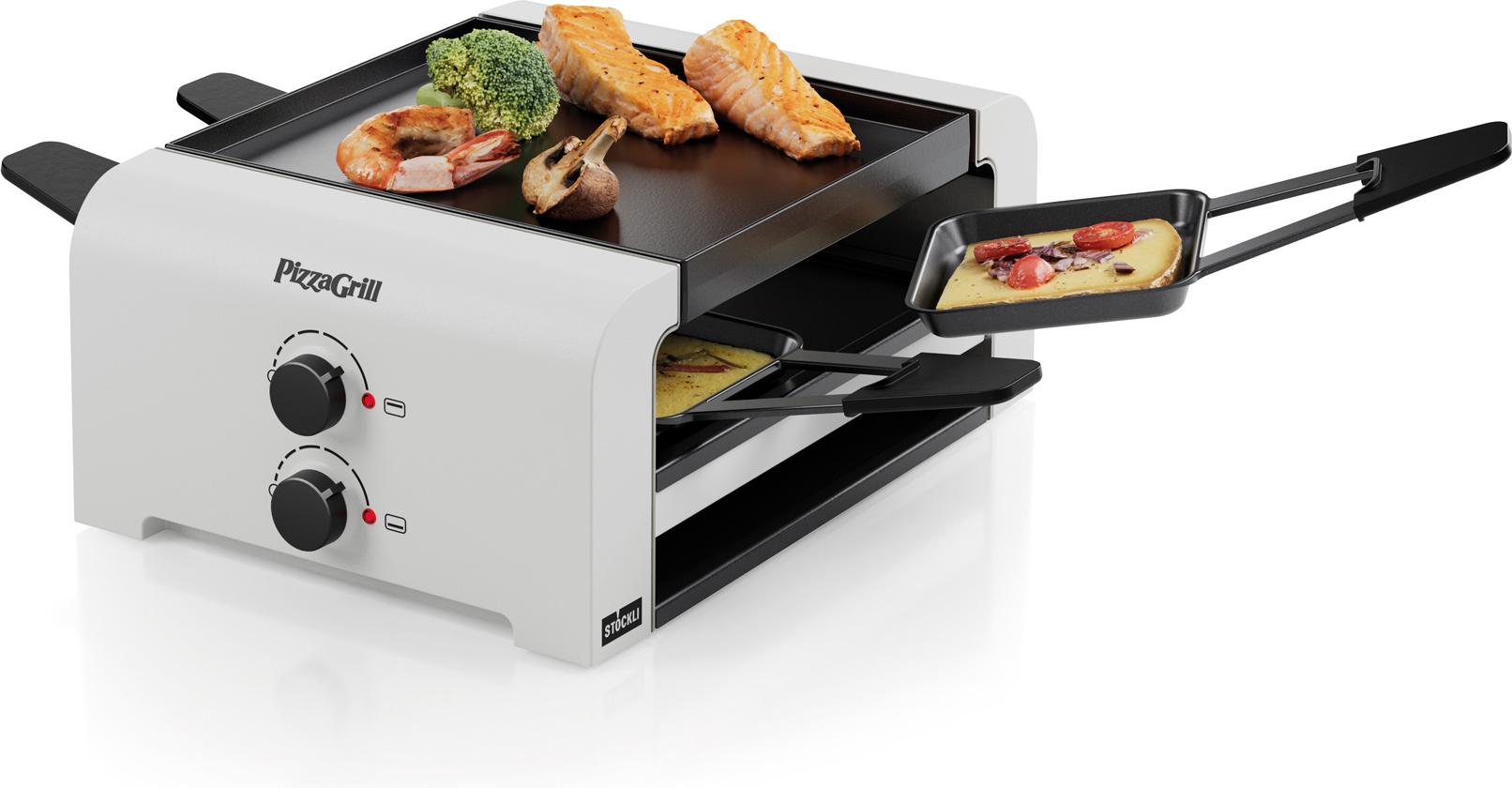 Tischgrill für Pizzas, Raclette und mehr. Mit Ober- und Unterhitze-Reglern und Parkdeck. Für 4 Personen.
