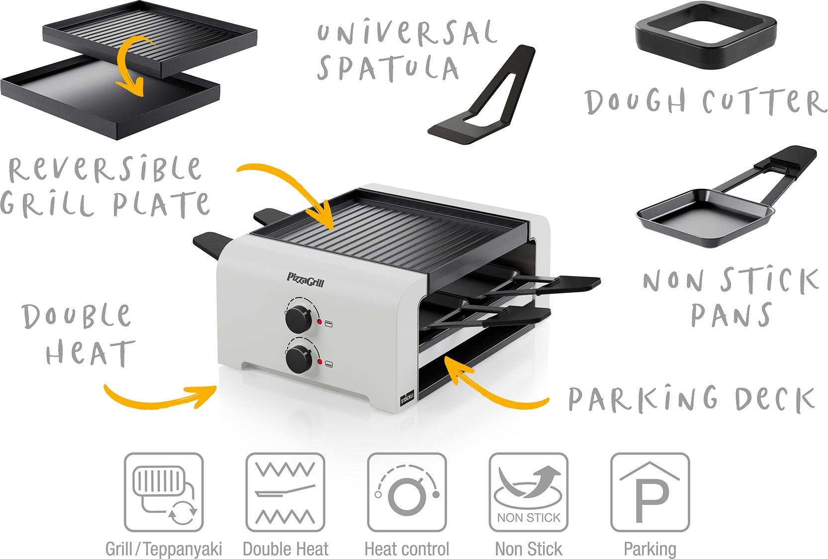 Der PizzaGrill 4 definiert das Erlebnis des gemeinsamen Kochens neu. Mit diesem multifunktionalen Tischgrillgerät lassen sich Mini-Pizzas, Raclette und weiteren Köstlichkeiten zubereiten. Die stufenlos einstellbaren Ober- und Unterhitze-Regler ermöglichen es, die Temperatur exakt auf die Anforderungen der Gerichte abzustimmen. Die Flexibilität des Geräts wird durch die universellen Pfännchen und das praktische Parkdeck noch erweitert, während die Wende-Grillplatte einen mühelosen Wechsel zwischen klassischem Grillen und Teppanyaki-Style erlaubt. Der PizzaGrill 4 garantiert nicht nur vielfältige kulinarische Genüsse, sondern auch Spaß und Kreativität beim Kochen.