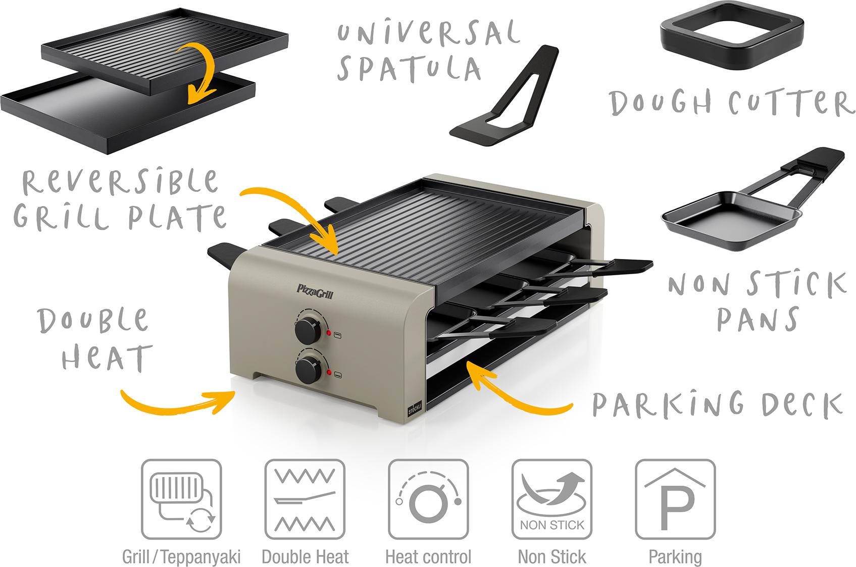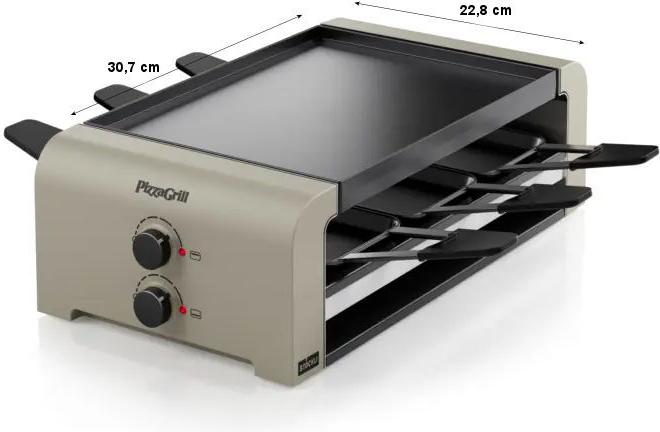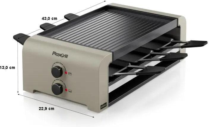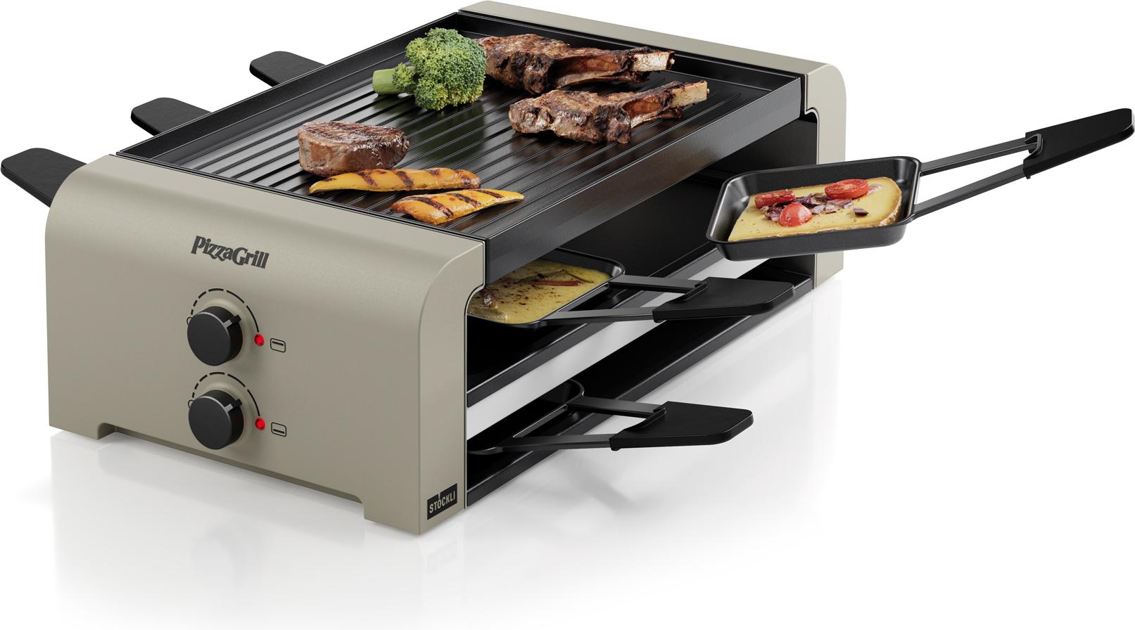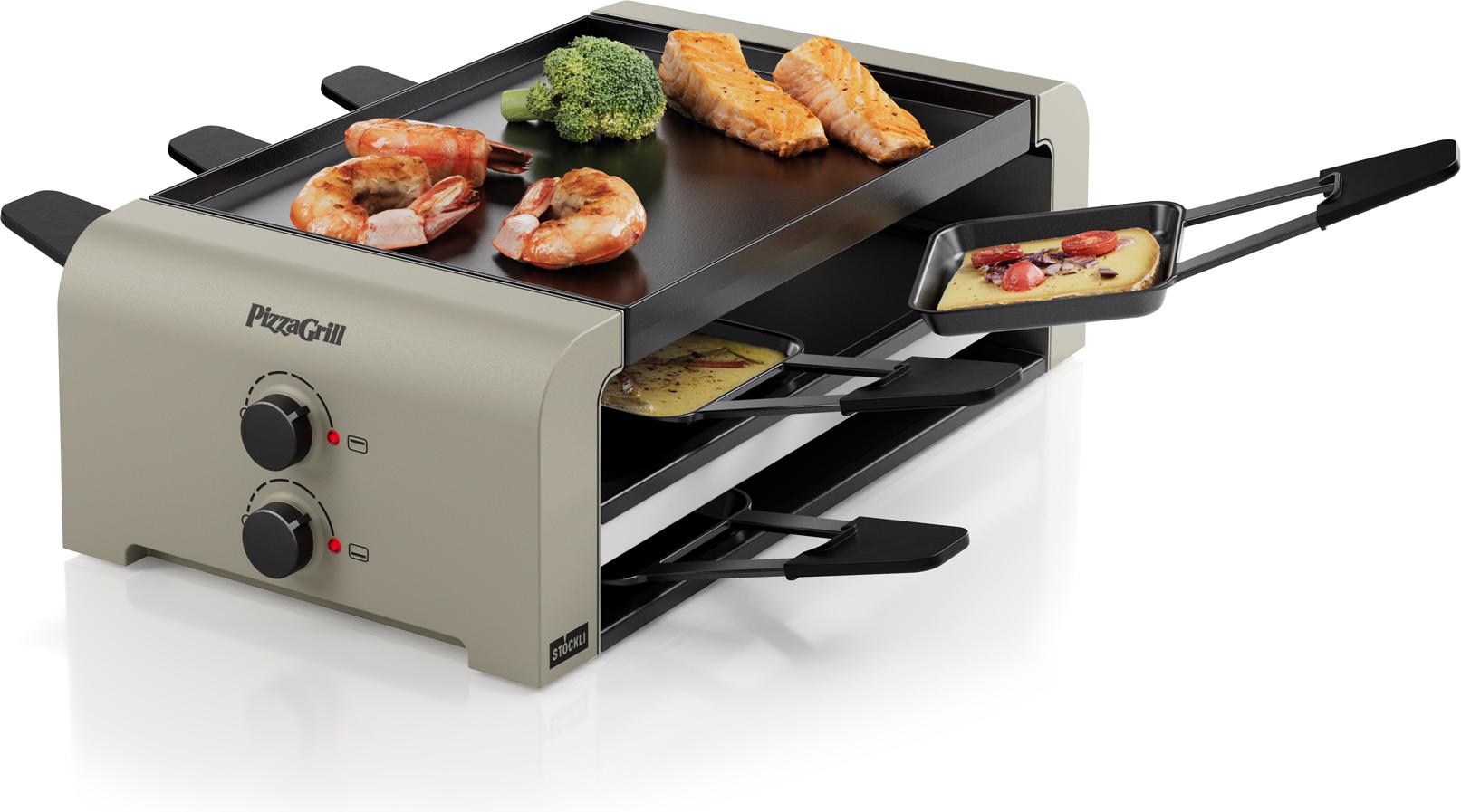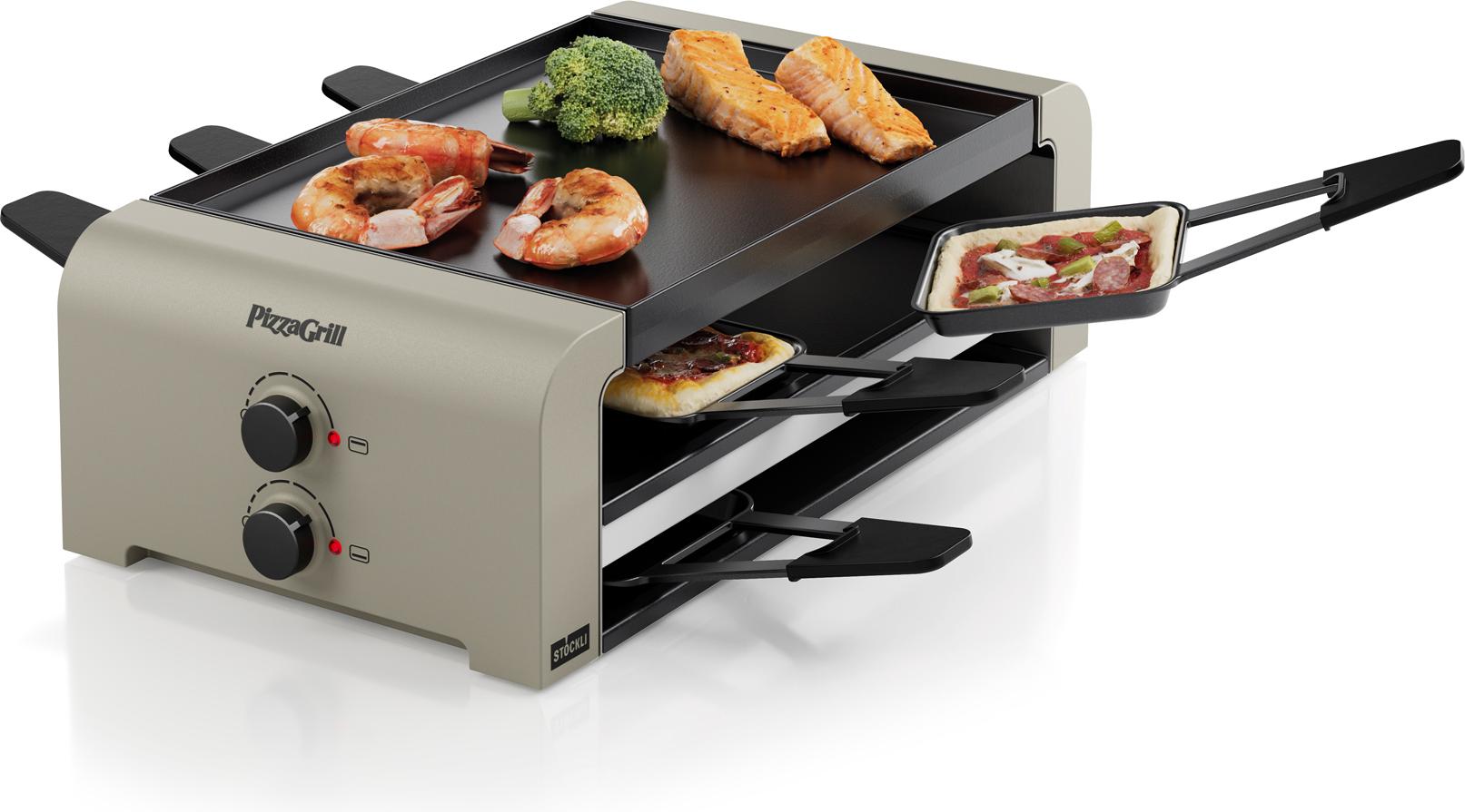 Tischgrill für Pizzas, Raclette und mehr. Mit Ober- und Unterhitze-Reglern und Parkdeck. Für 6 Personen.