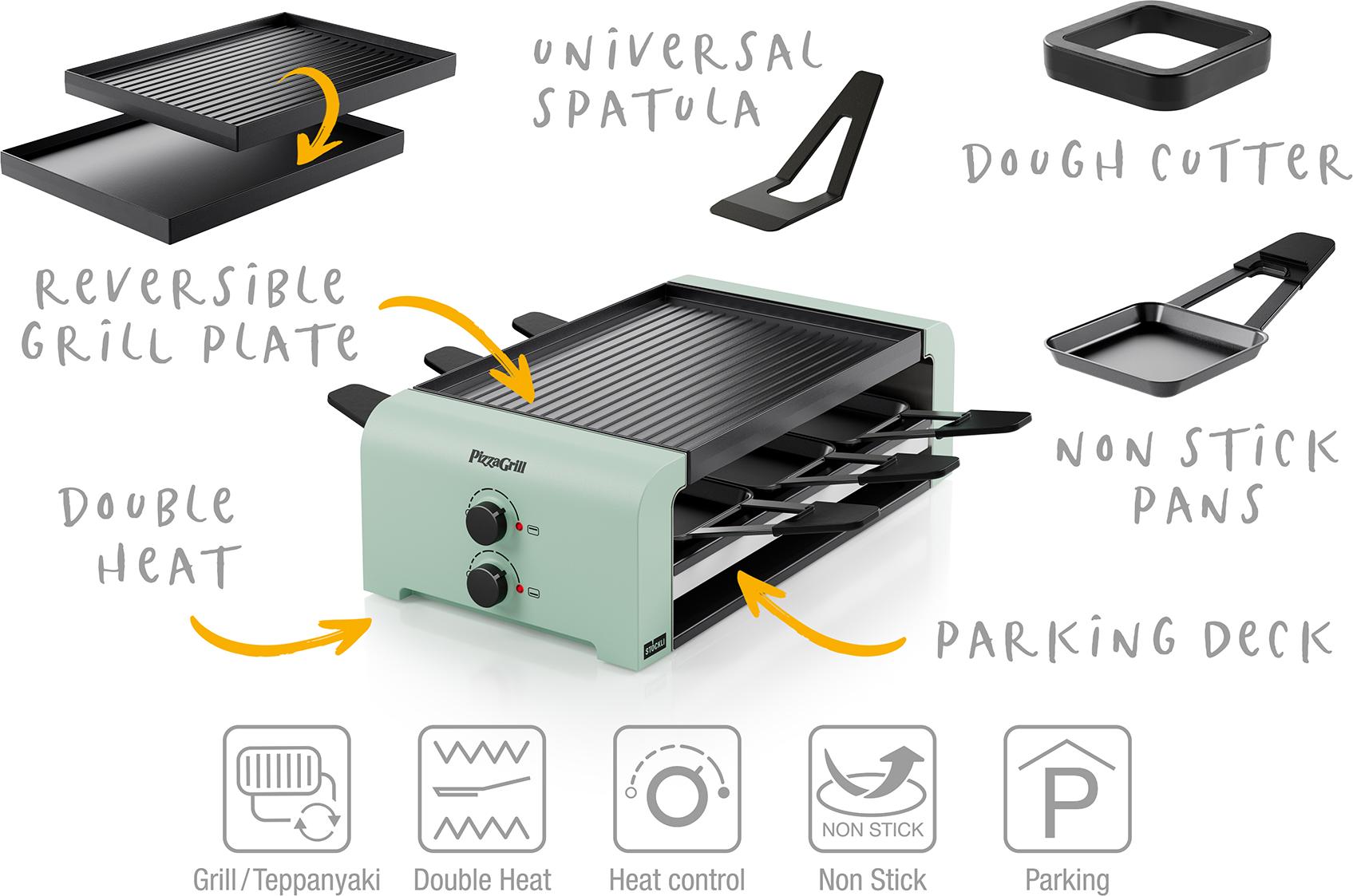 Das Gerät ist mit sechs antihaftbeschichteten Stahlblech-Pfännchen, sechs Raclettespachteln/wenden aus Kunststoff, einem Teigausstecher für Mini-Pizzas und einer Wende-Grillplatte ausgestattet und eignet sich somit für ein Essen mit bis zu sechs Personen. Der PizzaGrill 6 bietet vielseitige Möglichkeiten, unterschiedliche Gerichte gemeinsam zu kochen und zu genießen.
