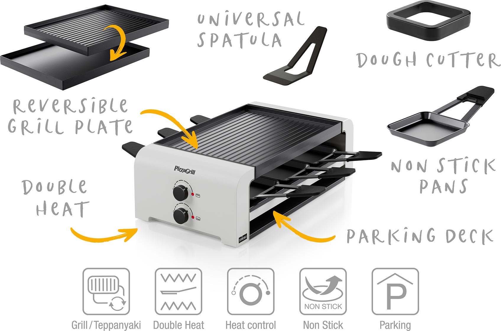 Das Gerät ist mit sechs antihaftbeschichteten Stahlblech-Pfännchen, sechs Raclettespachteln/wenden aus Kunststoff, einem Teigausstecher für Mini-Pizzas und einer Wende-Grillplatte ausgestattet und eignet sich somit für ein Essen mit bis zu sechs Personen. Der PizzaGrill 6 bietet vielseitige Möglichkeiten, unterschiedliche Gerichte gemeinsam zu kochen und zu genießen.