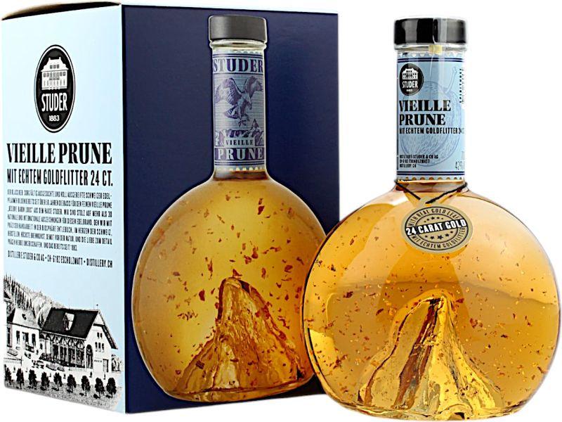Der exquisite Studer Swiss Premium Gold Selection Vieille Prune Réserve Baron Louis basiert auf handverlesenen, vollreifen Edel-Pflaumen. Nur die besten Zutaten kommen in das edle Destillat, was zu einem konzentrierten Produkt führt, das seinen vollen Fruchtgeschmack entfaltet. Nach einer langen Reifung verwandelt sich dieser aromatische Anteil in einen hochwertigen Edelbrand. Das Ergebnis ist eine liebevoll hergestellte Delikatesse aus dem Hause Studer mit einem bemerkenswerten und intensiven Geschmack. Beigefügt sind hier 24 Karat Goldflitter. Abgefüllt wurde der Swiss Premium Gold Selection Vieille Prune Réserve Baron Louis mit 42.0% vol.