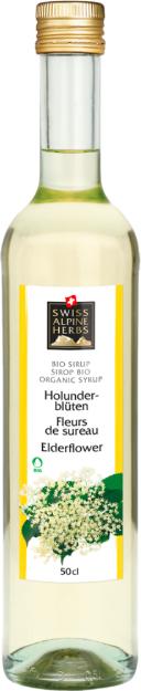 Swiss Alpine Herbs liefert Ihnen den Bio Holunderblüten Sirup in einer 5 dl Glasflasche mit Ausguss für tropffreies Dosieren.