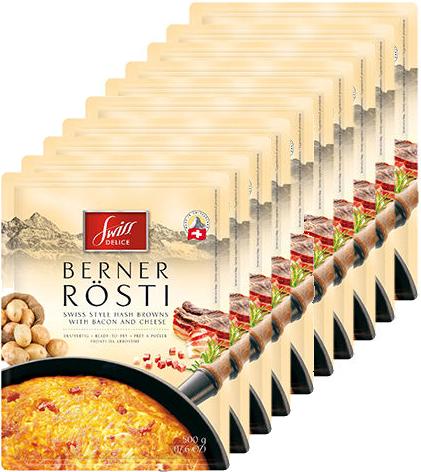 Swiss Delice lädt anspruchsvolle Genießer zu einer kulinarischen Reise durch die Schweiz ein. Mit der original Berner Rösti können Sie ein Stück Schweiz direkt zu sich nach Hause bringen - verfeinert mit rauchigem Speck und Schweizer Käse. Die Swiss Delice Berner Rösti sind eine schweizerische Kartoffelspezialität nach Originalrezept. Sie sind einfach zuzubereiten und benötigt keine Zugabe von Butter, Öl oder Gewürzen. Die Rösti mit Speck sind bereits bratfertig und sehr einfach in der Zubereitung.