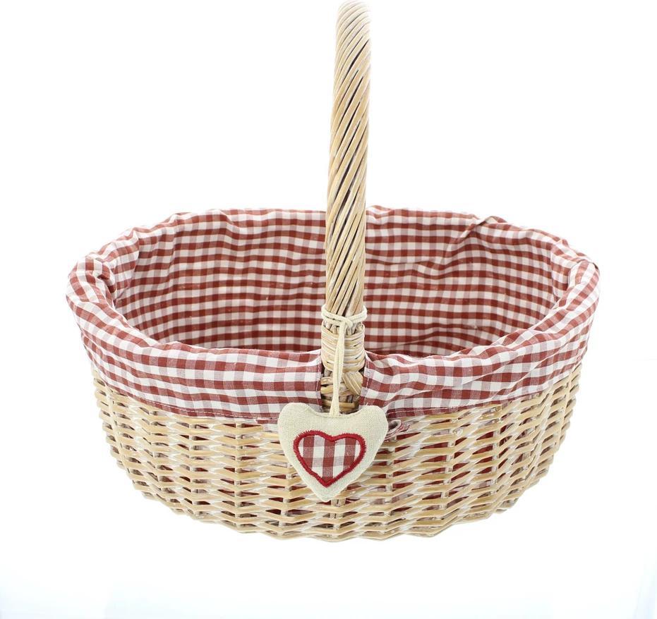 Einkaufshelfer in trendig rustikalem Karodesign, weiß gekalkte und stabil geflochtene Spaltweide. Herausnehmbarer Stoffeinsatz in nostalgischem Rot/Weiß.