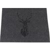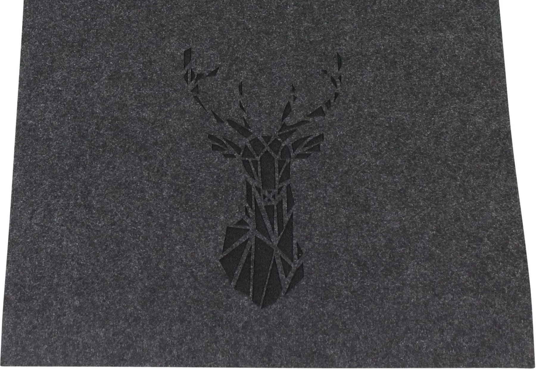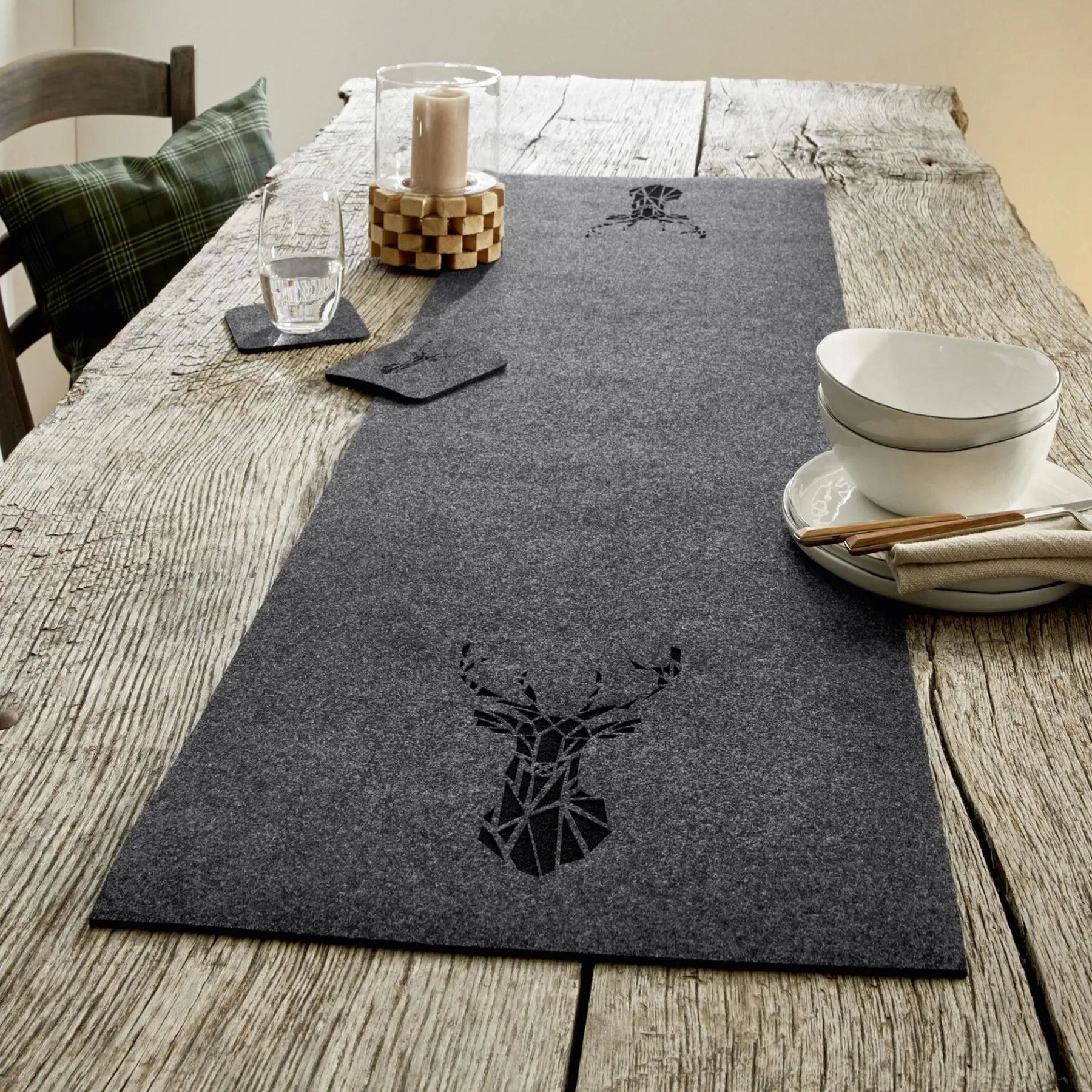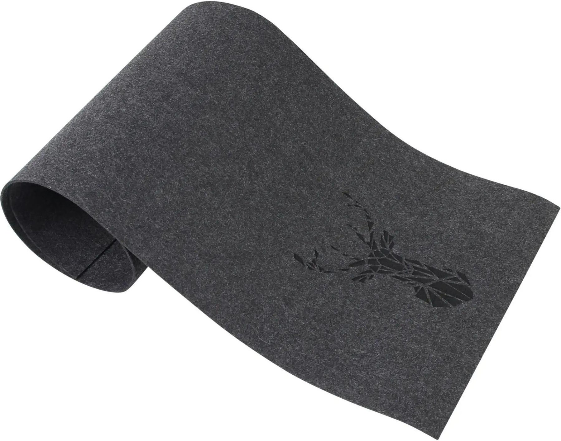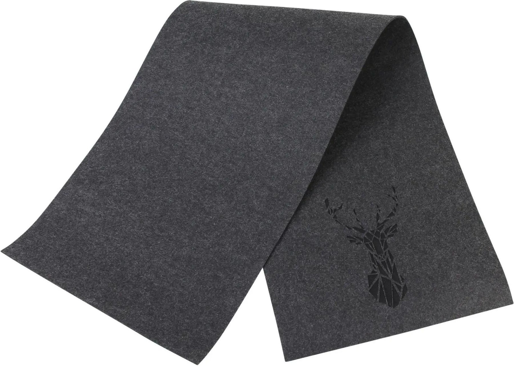 Der Tischläufer ist aus dunkelgrauem Filz und mit einem schwarzen Hirsch Motiv geprägt.