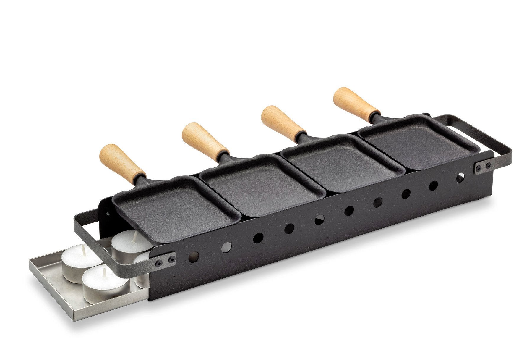 Käseschmelzer für 1–4 Personen. Thermolackierter Stahl. Sichere Heizleistung durch Direkthitze auf Pfännchenboden.